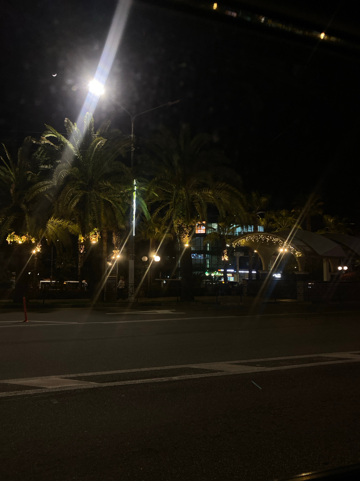 This nocturnal image, taken in Sochi, Russia, presents a lively urban or resort scene from an elevated viewpoint. In the lower portion of the frame, a paved road is visible, marked with white lines t…read more