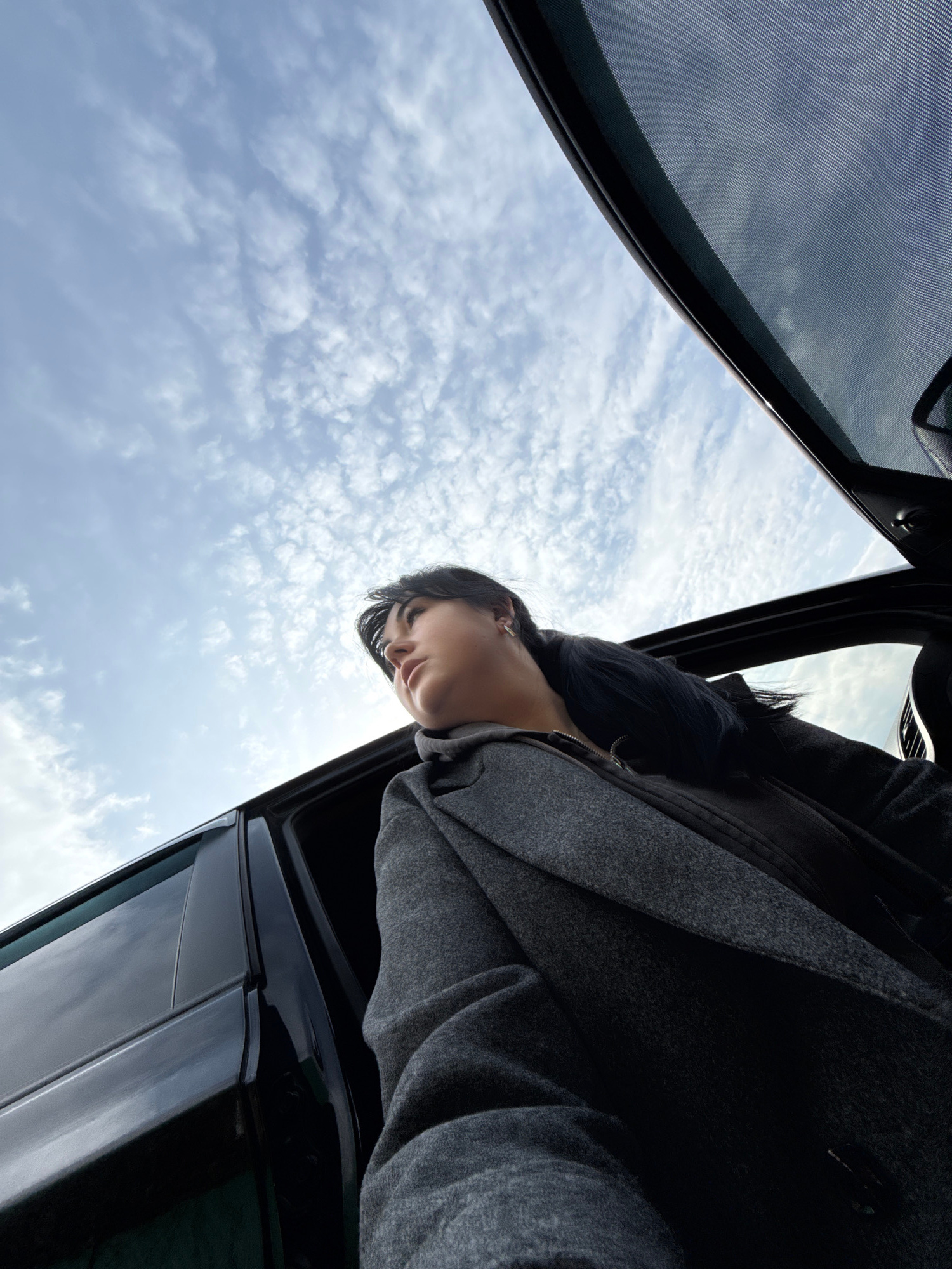 A low-angle shot shows a woman looking down from a car. She has dark hair and is wearing a gray coat. The sky is visible through the open car window, with wispy clouds scattered across the blue. The i…read more