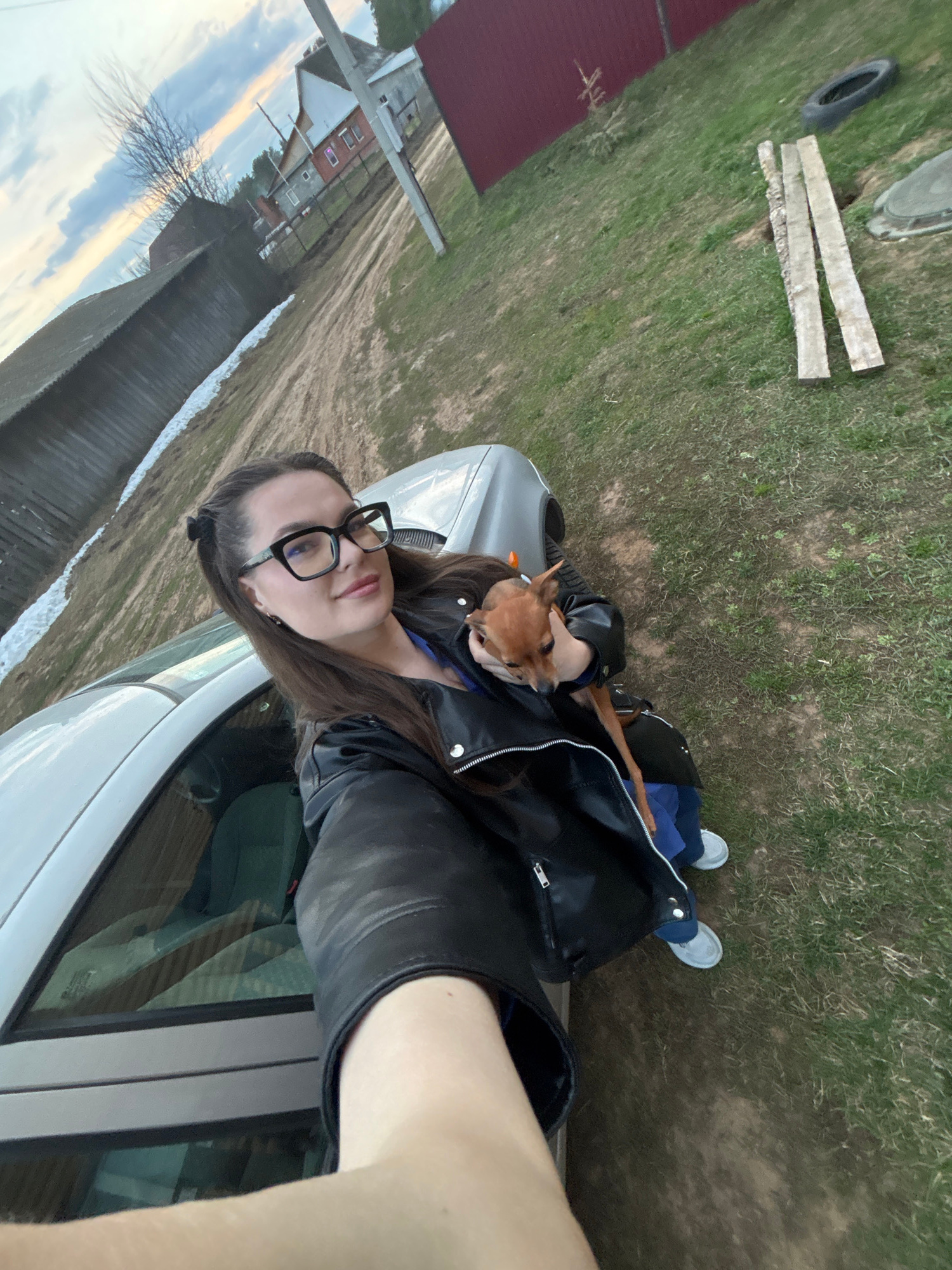 The image depicts a young woman with long brown hair wearing glasses and a black leather jacket. She is sitting on a white car and holding a small brown dog. The location appears to be a rural or subu…read more