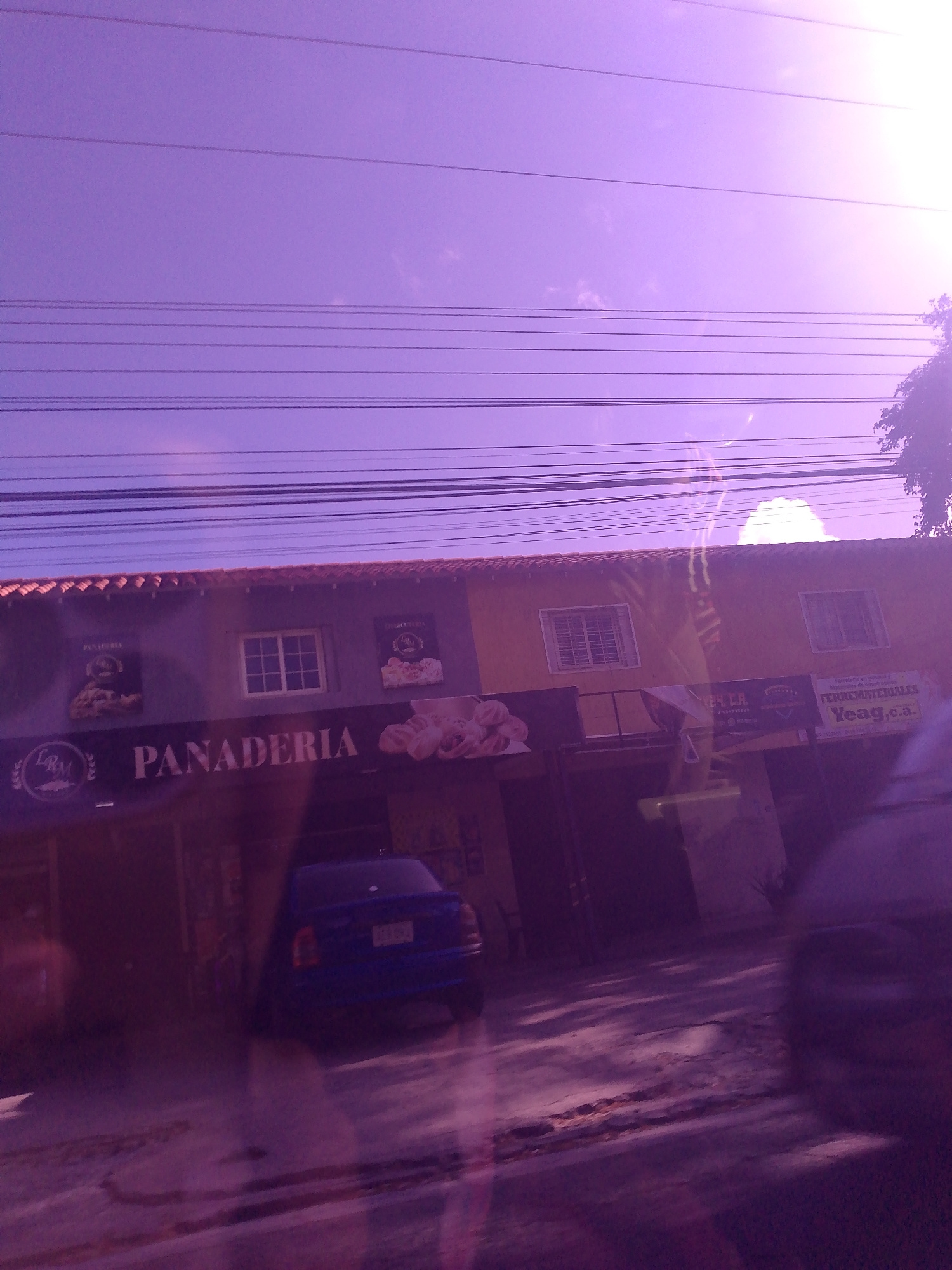 The image depicts the front facade of a one-story building in La Asuncion, Venezuela, identified by a sign reading "PANADERIA." A blue car is parked in front of the bakery. Overhead, numerous electric…read more