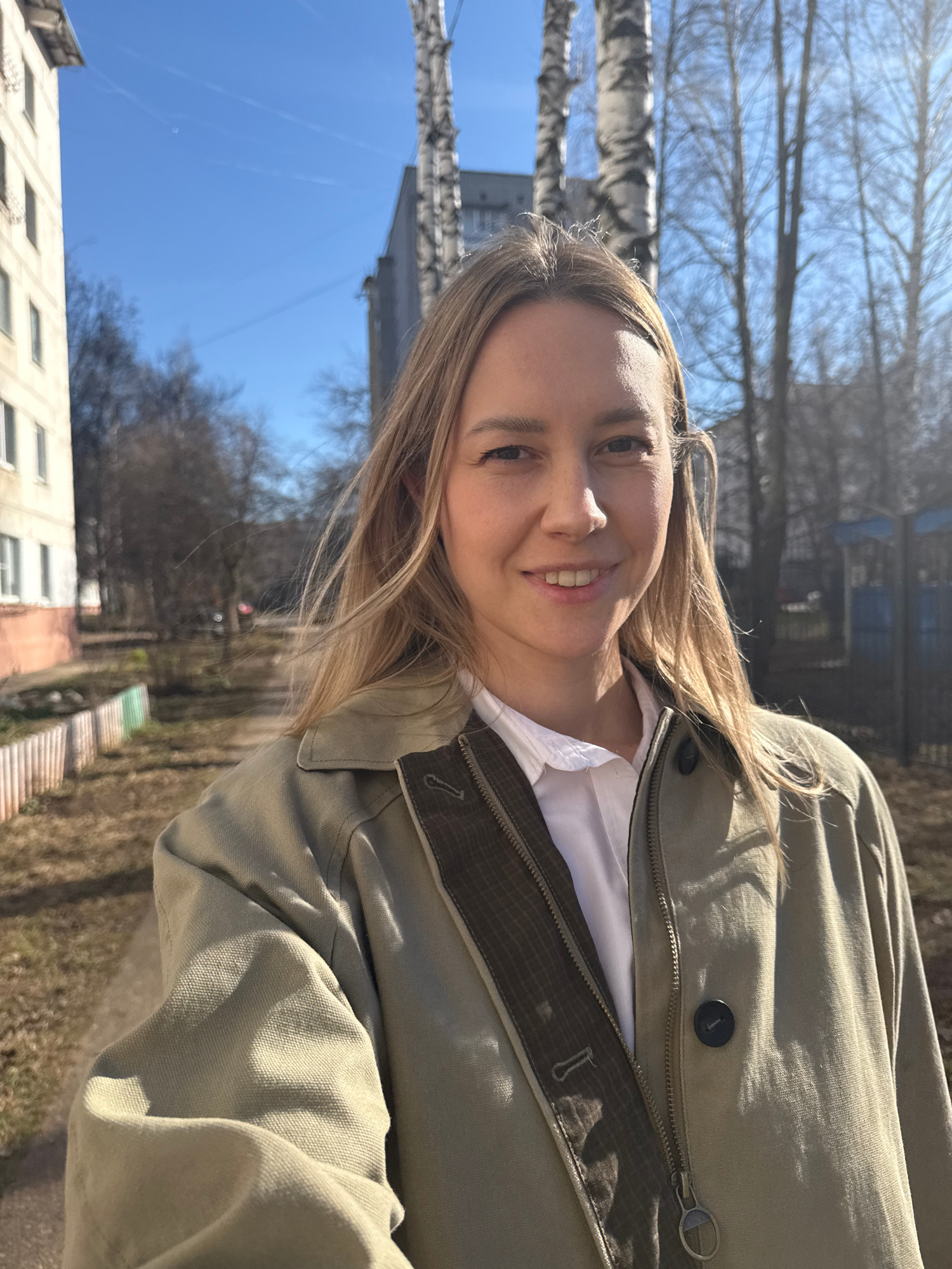 A young woman is depicted in an outdoor setting under bright daylight, likely in Chaikovsky, Russia, during late winter or early spring. The image is oriented sideways. She has light blonde hair and i…read more