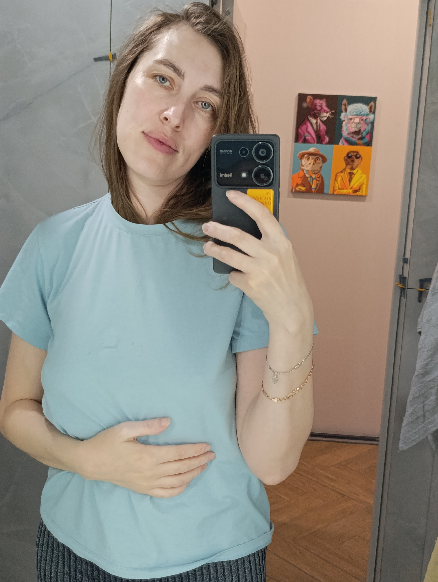 A fair-skinned woman with light brown hair and blue eyes takes a selfie in a bathroom. She's wearing a light blue T-shirt and what appears to be gray striped pajama bottoms. Her left hand is resting o…read more