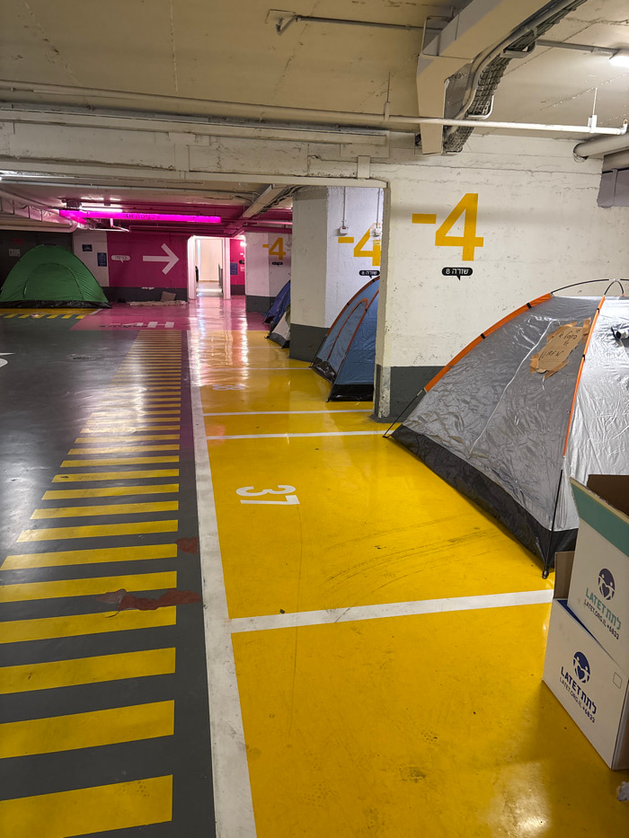 The scene depicts Level -4 of an underground parking garage in Tel-Aviv, Israel, repurposed as a temporary shelter. Numerous small dome tents are pitched directly on the parking spaces. On the right…read more