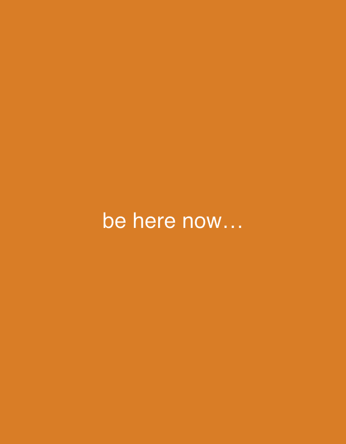 The image displays the phrase "be here now..." in white text centered on an orange background. The location is not evident from the image.