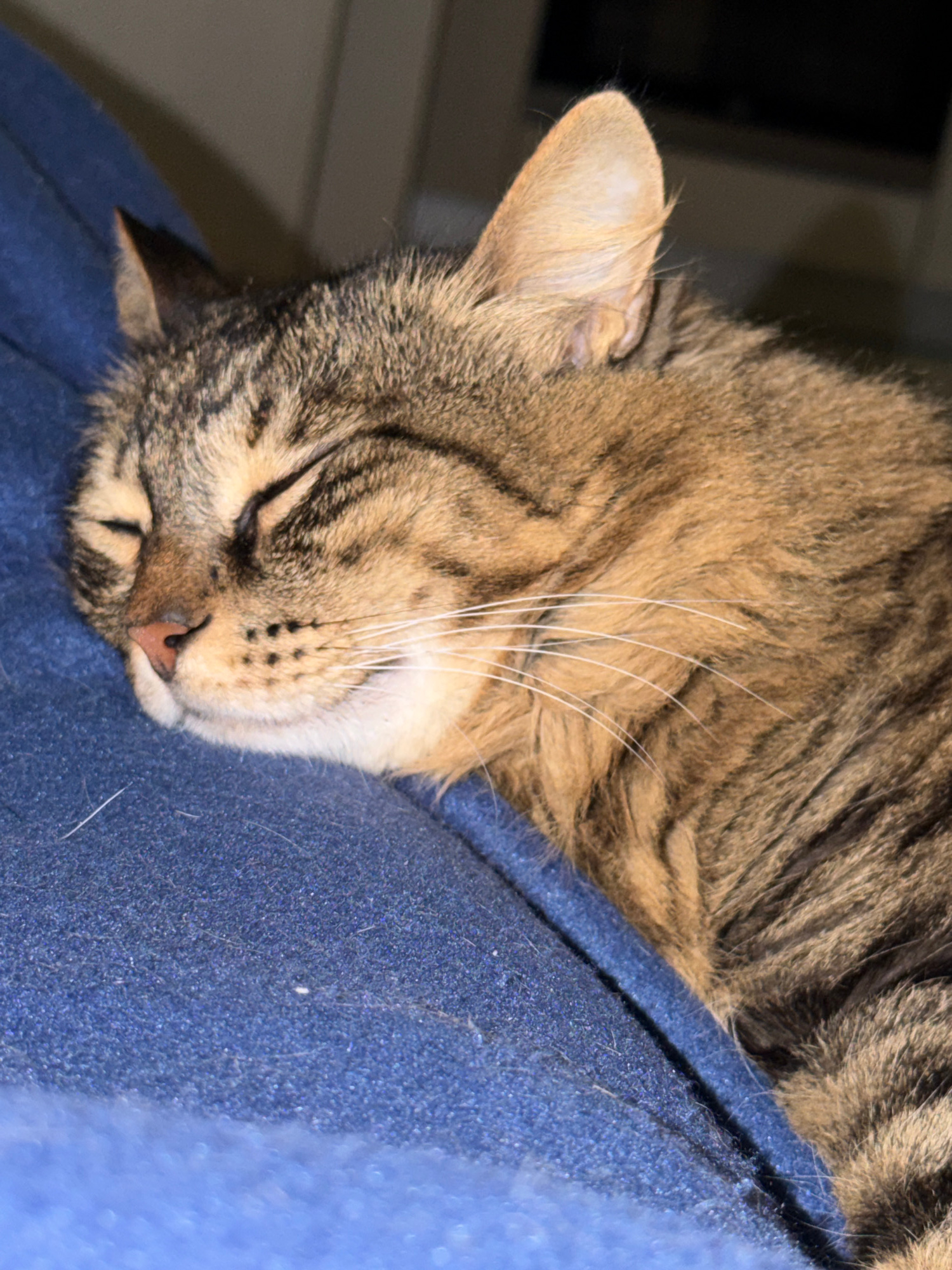 A close-up of a tabby cat asleep on a blue fabric surface. The cat's head is angled downwards to the left, with its eyes closed. The cat's fur is a mix of brown and black stripes. White whiskers are v…read more