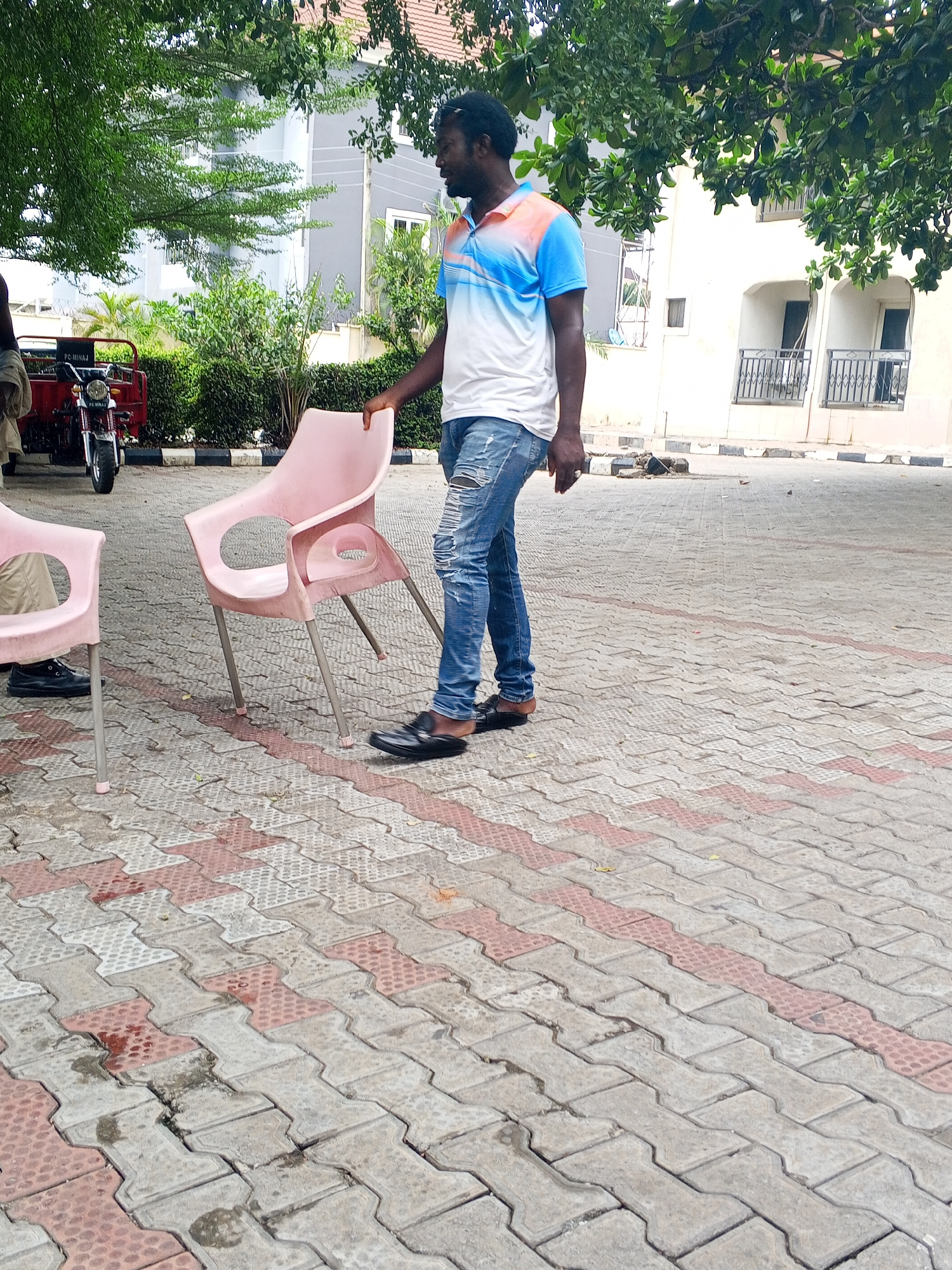 A man stands next to a pink plastic chair on a paved surface in Lokoja, Nigeria. The paving consists of interlocking, dog-bone-shaped concrete blocks in alternating rows of gray and red. The man is Bl…read more