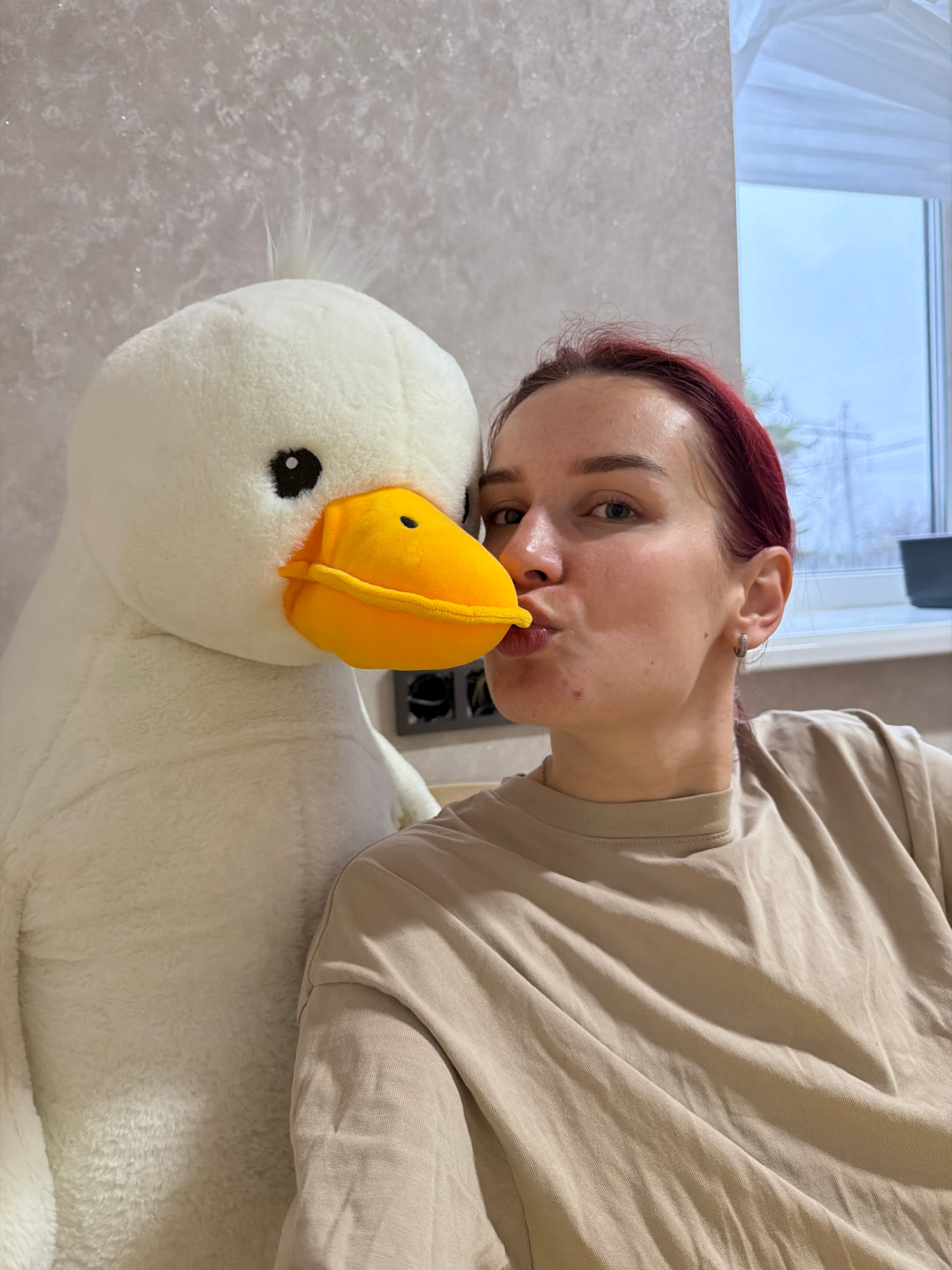 A young woman with red hair is positioned sideways, appearing to kiss the beak of a large, plush white goose with a yellow beak. She is wearing a beige t-shirt and a silver hoop earring. The backgroun…read more