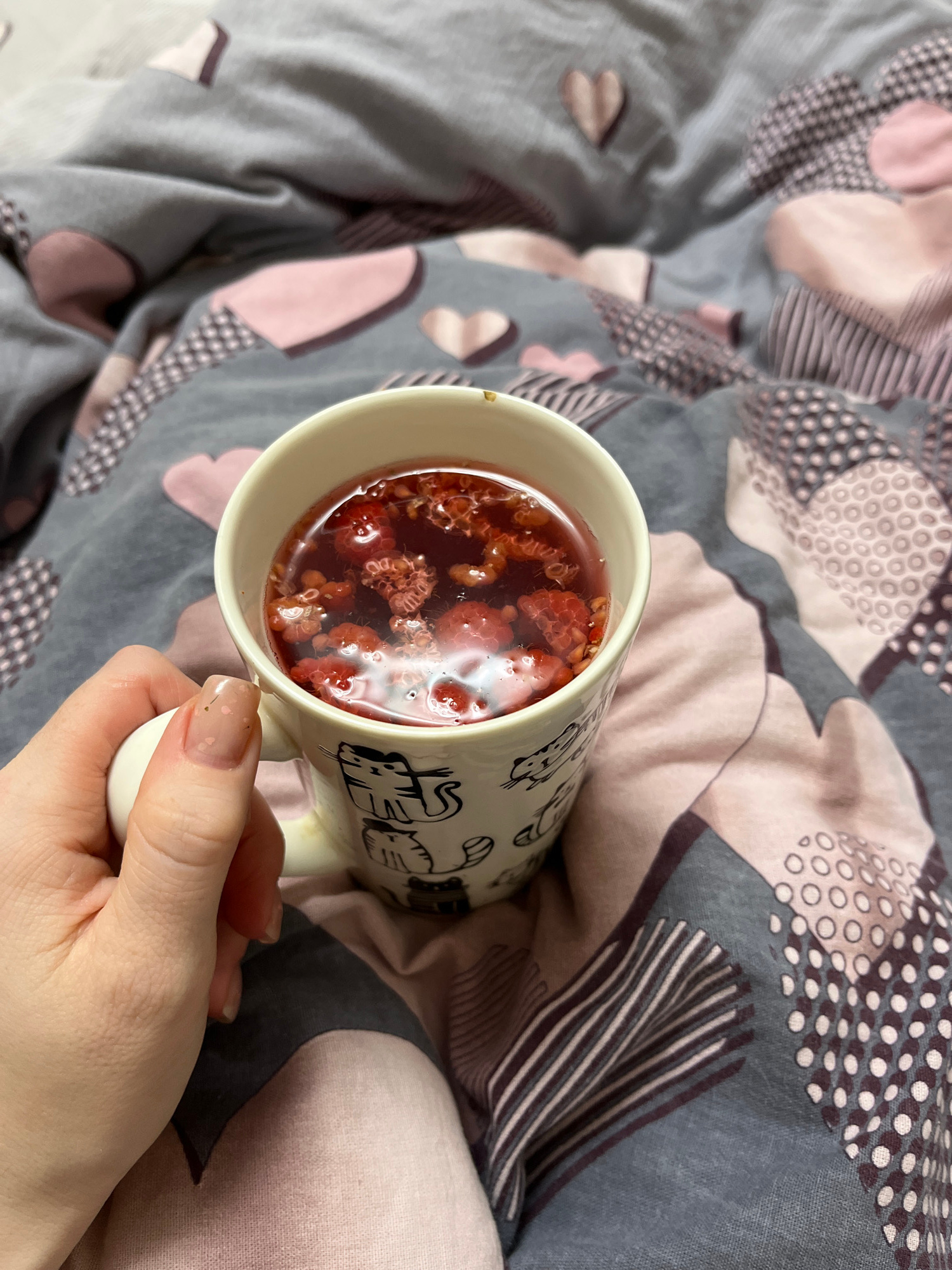 A photograph depicts a person holding a mug of raspberry tea over a patterned duvet cover. The mug is white with black animal outlines. The tea appears dark red in color, filled with whole raspberries…read more
