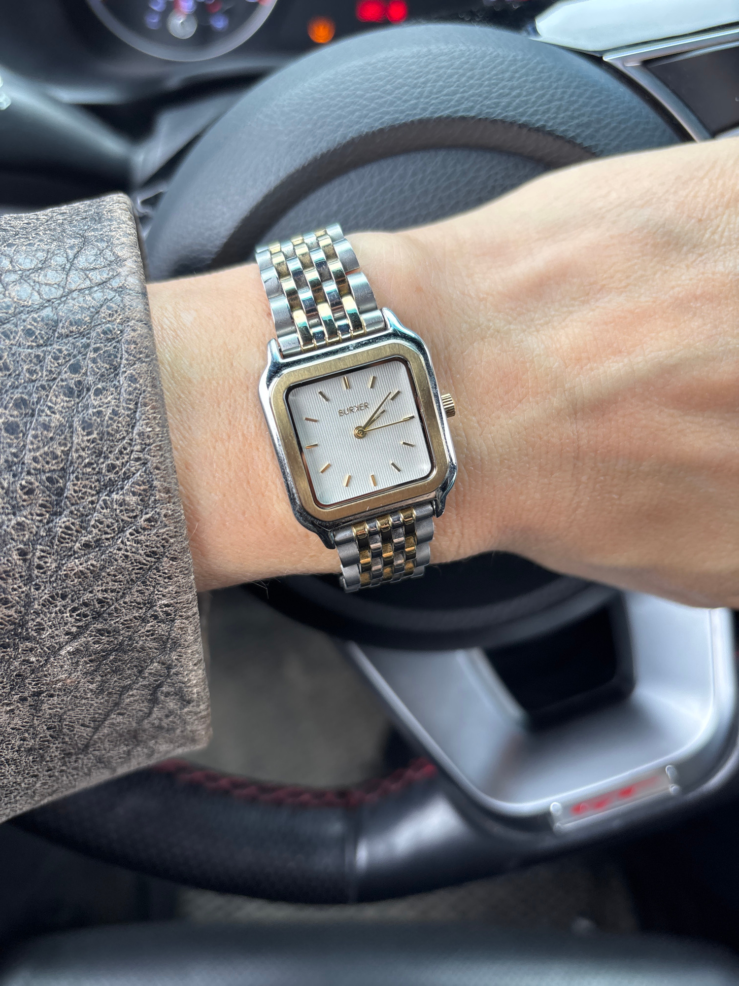 A person's wrist is displayed wearing a two-tone metal watch with a square face. The hand is resting on a car steering wheel. The person is wearing a patterned jacket.