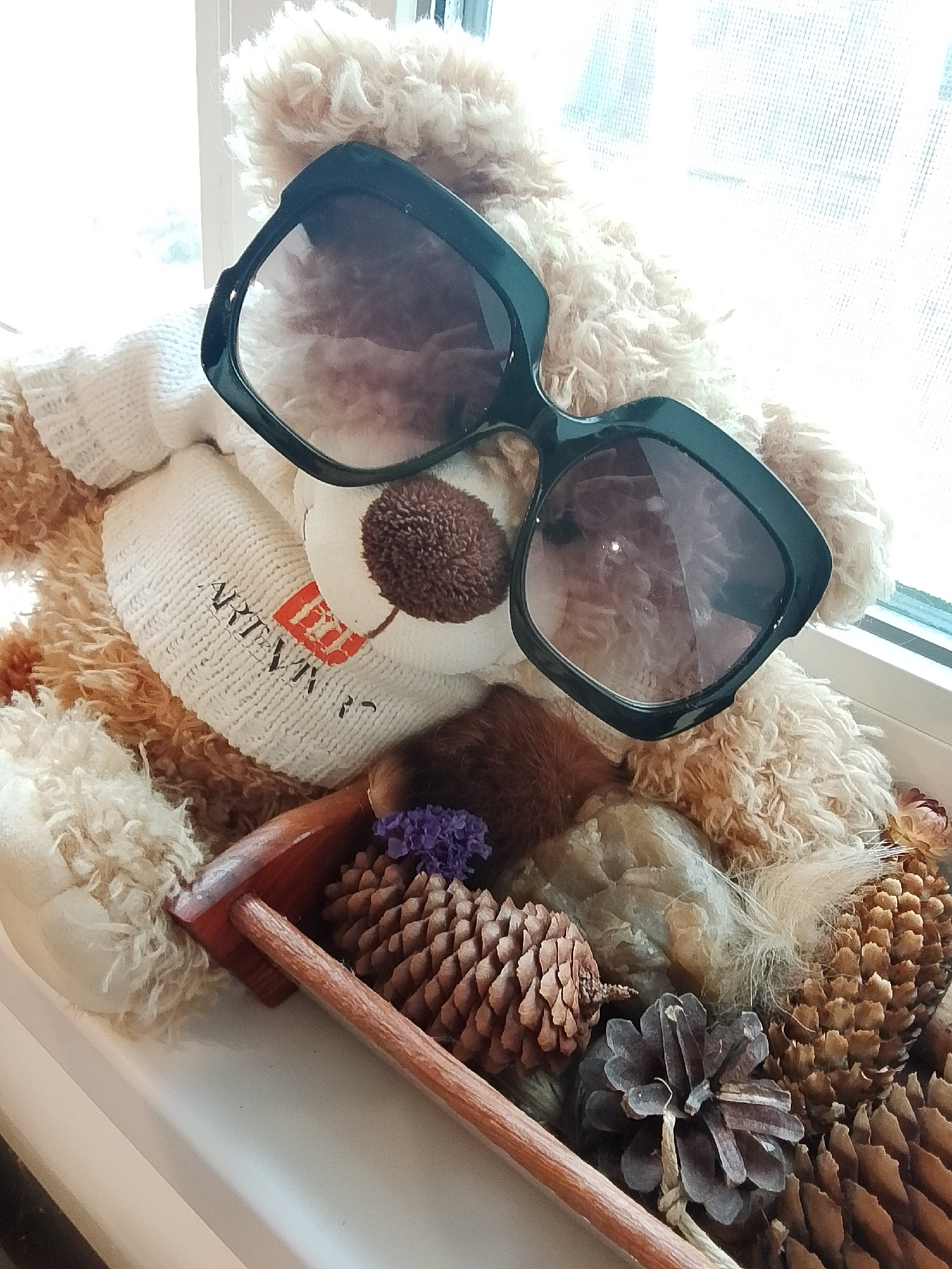 A teddy bear wearing a white knit scarf and large black sunglasses is positioned in front of a window. Below the bear is a wooden tray containing pinecones, small purple flowers, and other dried natur…read more