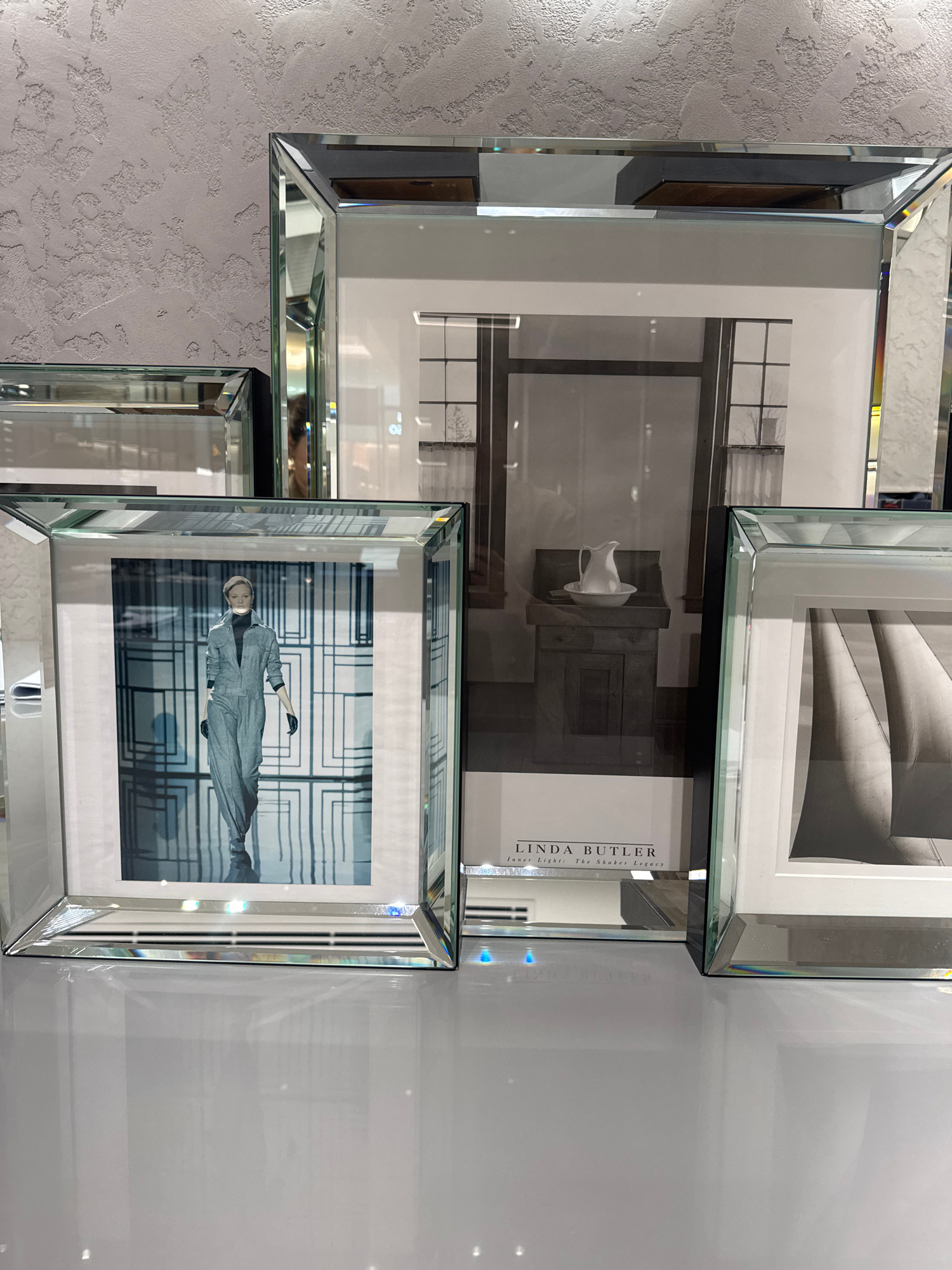 The image shows a decorative arrangement of framed black and white photographs on a wall. The frames appear to be mirrored. The visible photographs depict a staircase, a still life with a white object…read more