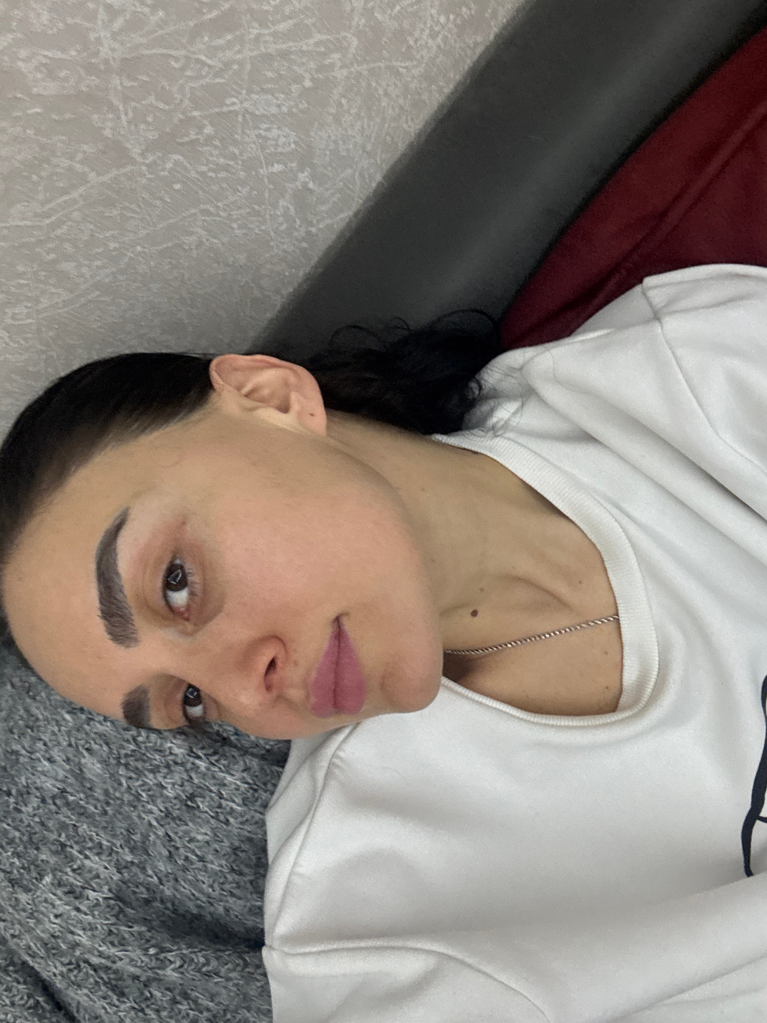 A medium shot of a woman with dark hair lying on a grey blanket, wearing a white sweatshirt and a silver chain. The background consists of a grey wall, a black surface, and a burgundy object. There is…read more