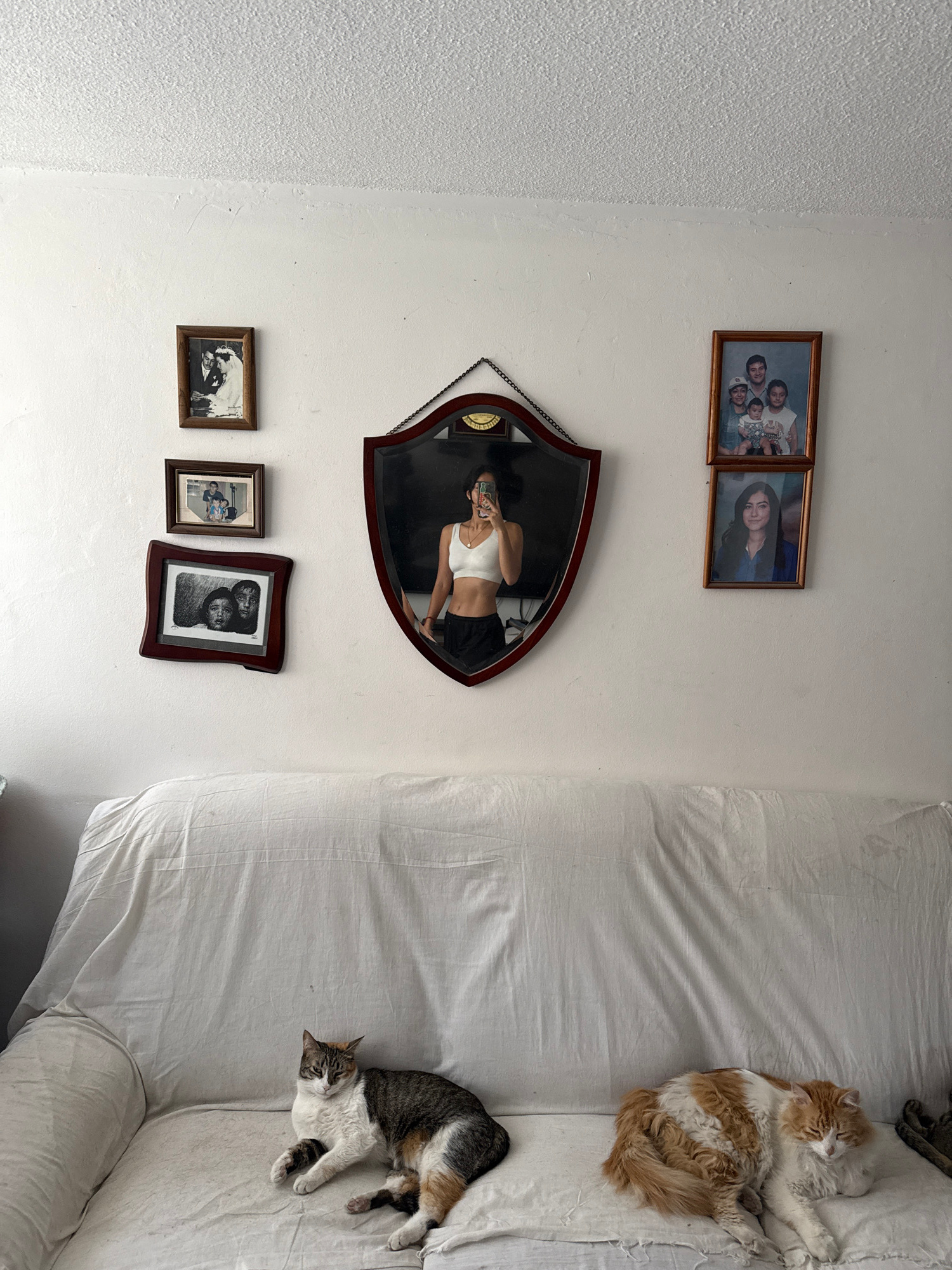 The image captures an interior space, likely a bedroom, within a residence in Puebla, Mexico. The wall is painted white with a textured surface. Arranged on the wall are three sets of framed pictures: two smaller ones at the top, one a family portrait and the other of a single woman; a larger, shield-shaped mirror reflecting a woman taking a picture of herself; and three smaller pictures at the bottom, two of which feature people or animals. A white couch or bed occupies the right side of the image, and two cats are lying on top of it: one an orange and white tabby, and the other a gray and white tabby. The environment appears domestic and lived-in. | Open Wire