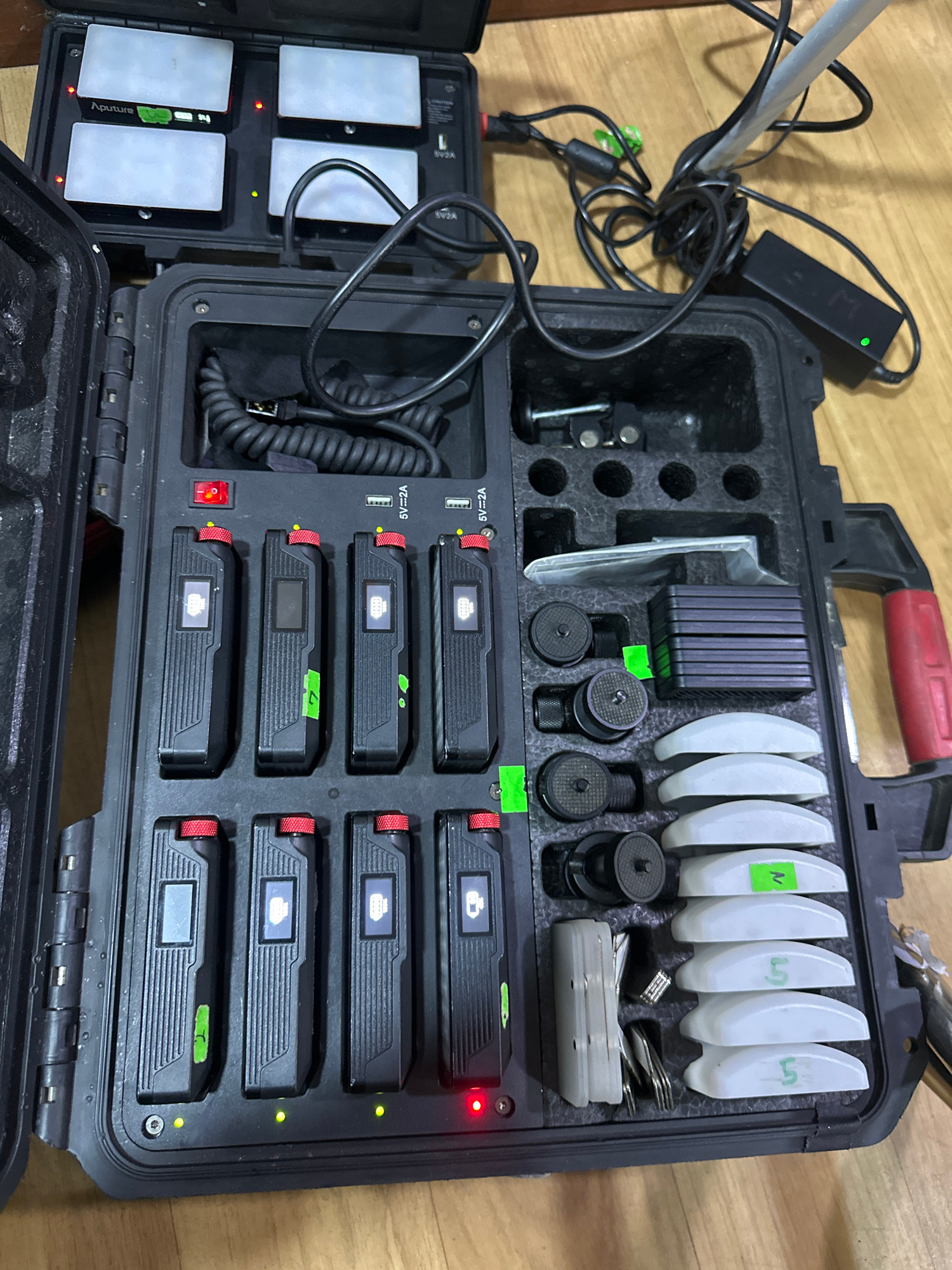 A black equipment case is open, displaying various electronic components. The case is divided into compartments containing items such as batteries, chargers, cables, and small accessories. Some of the…read more