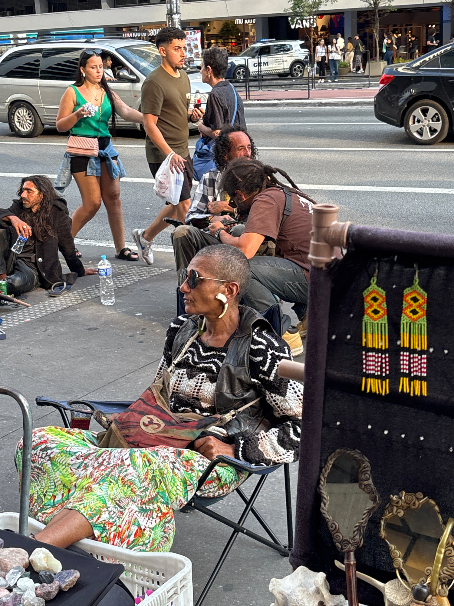 The image shows a street scene in São Paulo, Brazil, with a pedestrian sidewalk lined with a street vendor's display of handcrafted items and mirrors, and various people passing by. A vendor sits on a…read more