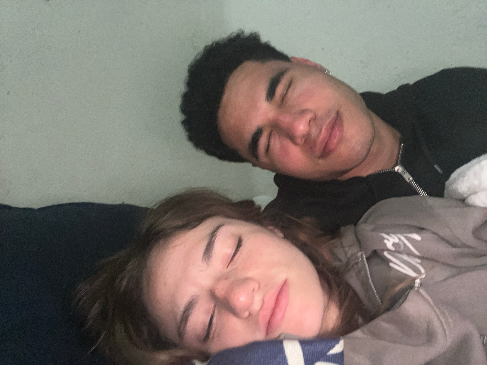 Two people are lying down, appearing to be asleep. One person has fair skin and light brown hair, and is wearing a gray jacket with white lettering. The other person has dark skin and short, dark curl…read more