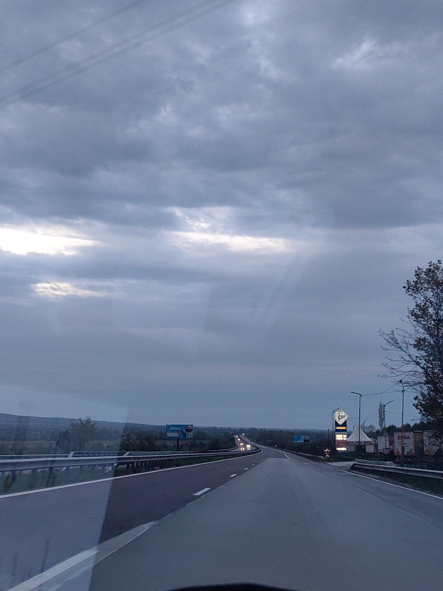 The image presents a view from inside a vehicle traveling on a multi-lane highway or major road in Kalugerovo, Bulgaria. The setting is characterized by an overcast, grey sky with patches of bright li…read more