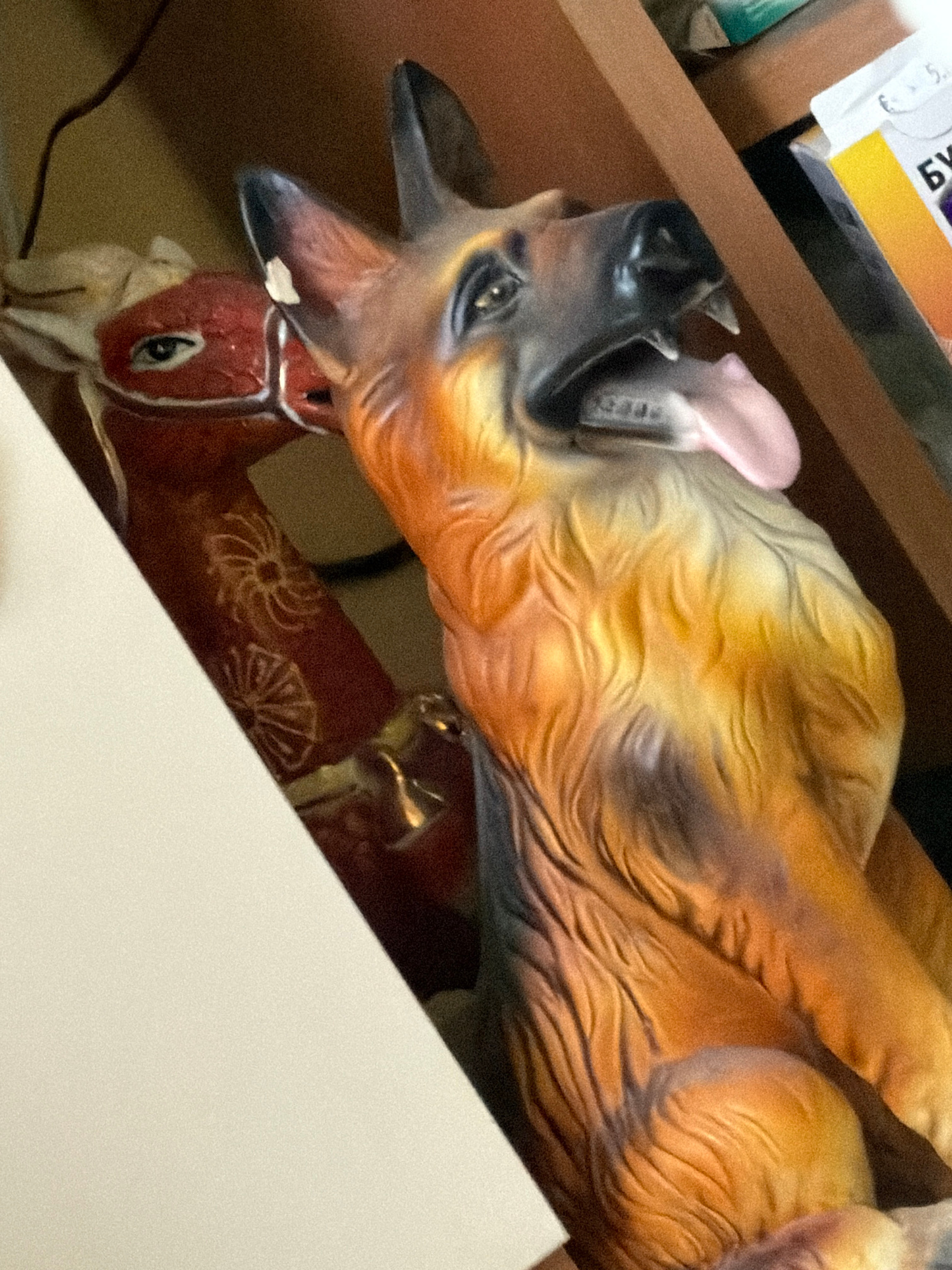 A close-up shot focuses on two figurines, one a German Shepherd and the other a reindeer, arranged on a shelf. The German Shepherd, positioned above the reindeer, has its mouth open, revealing painted…read more