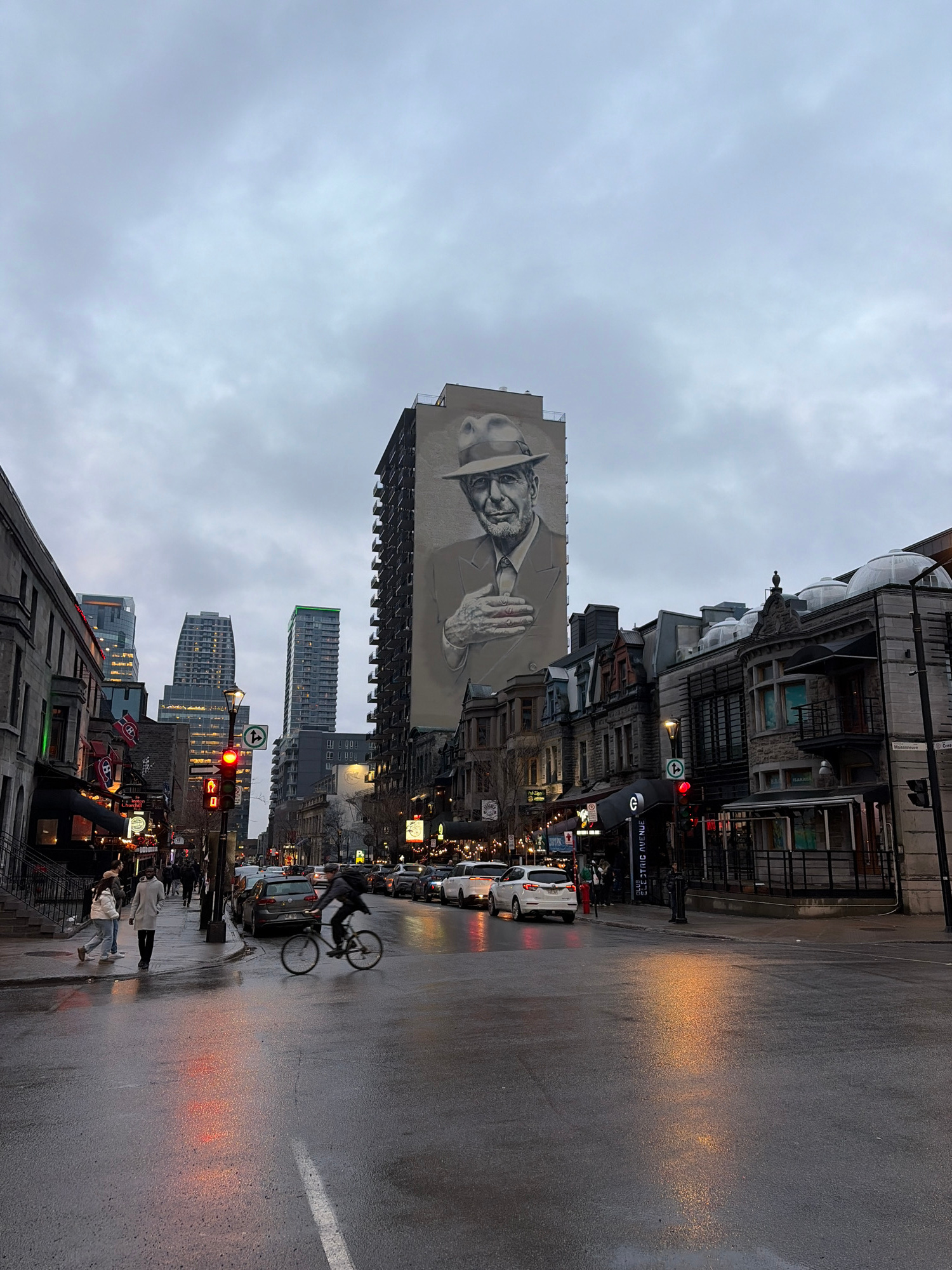The image depicts a street scene in Montreal, Canada on a wet, overcast day. The view is looking down a street lined with buildings of varying heights, styles, and ages. A large mural of a man in a fe…read more