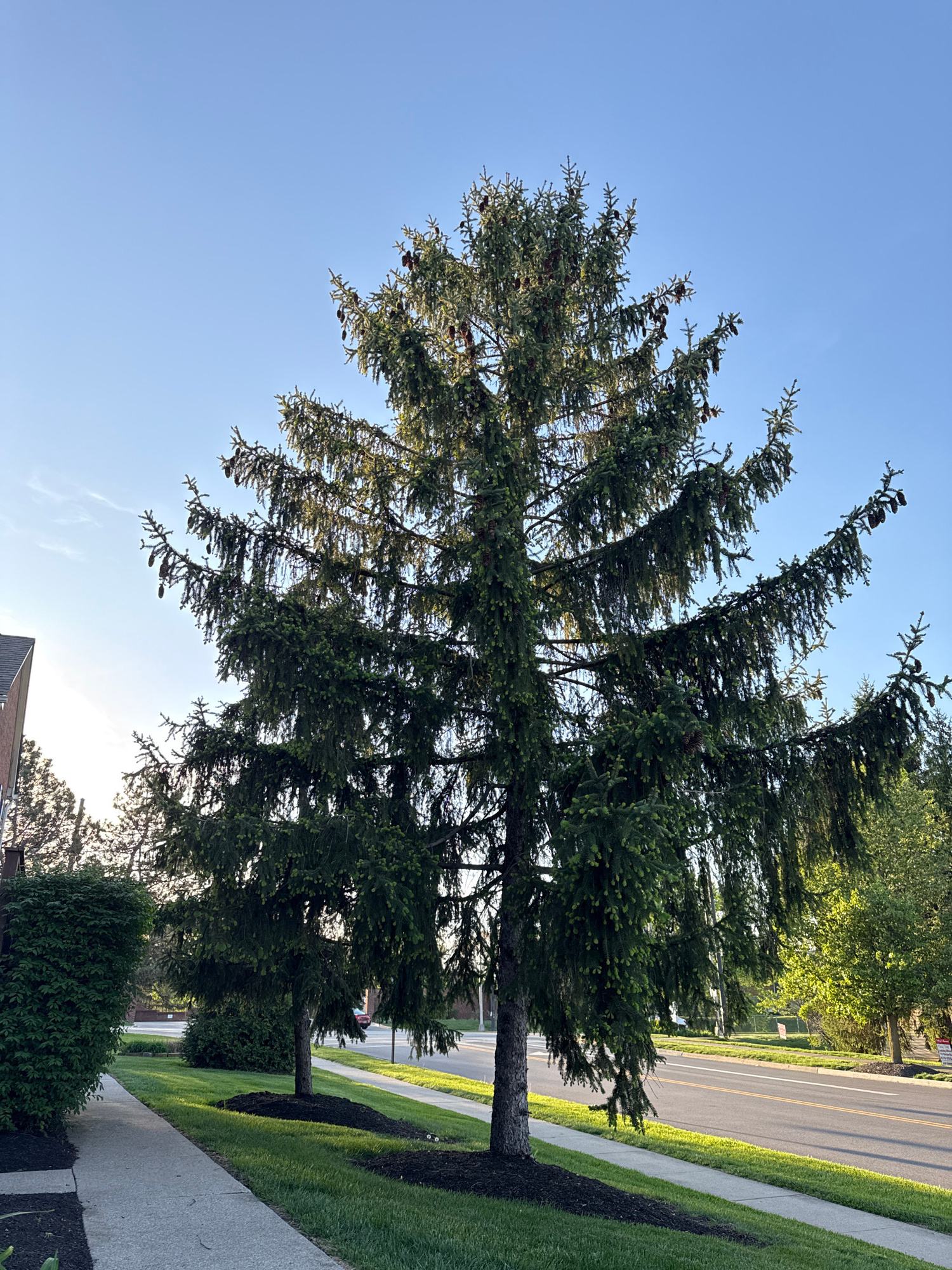 A vibrant outdoor scene captures a large, dense conifer tree, likely a spruce or fir, dominating the left side of the frame. The tree is abundant with green needles and numerous cones, some mature and…read more