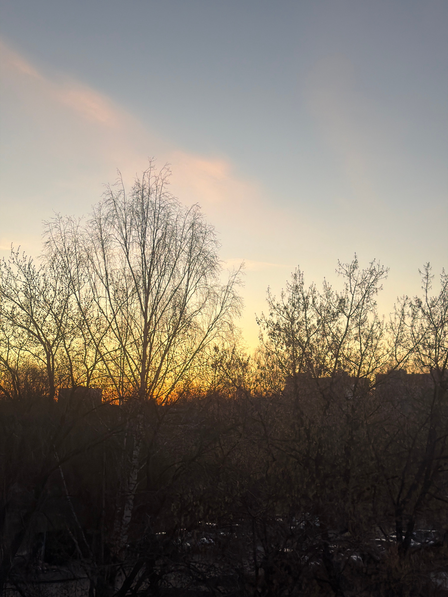 The image shows a view of trees silhouetted against a bright sky at sunset. The location is possibly Naberezhnye Chelny, Russia, although this cannot be definitively determined from the image. The tre…read more