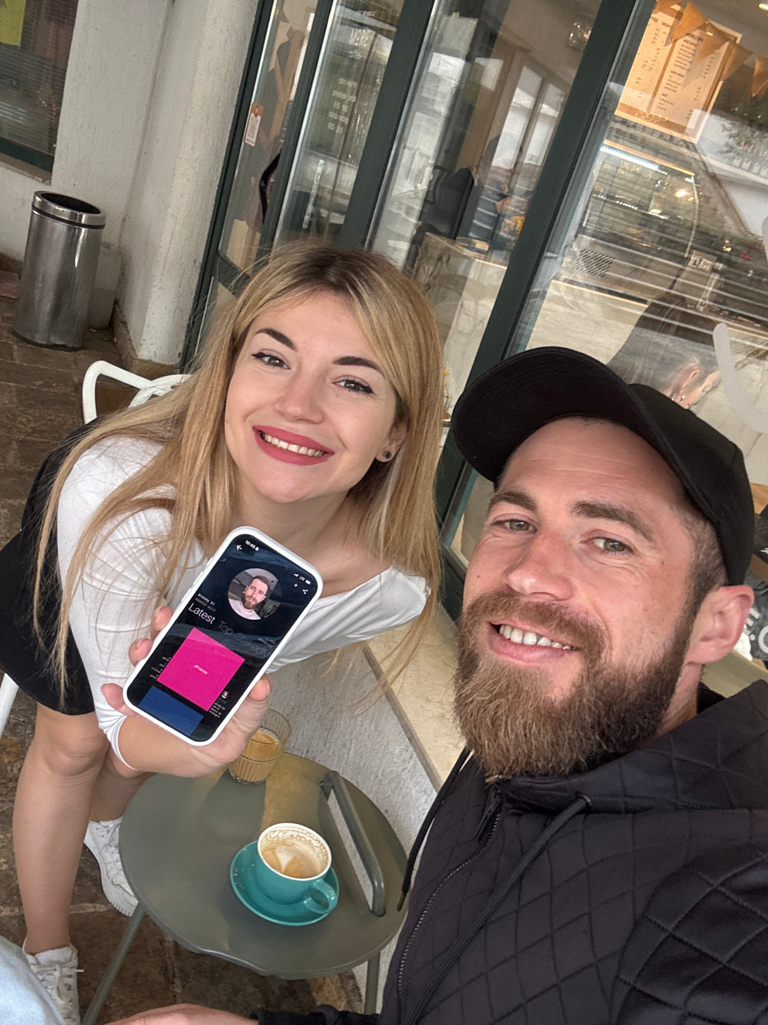 Two individuals, a male and a female, are captured in a selfie-style photograph within an indoor cafe setting. The male, positioned at the top right of the frame, wears a black baseball cap and a blac…read more