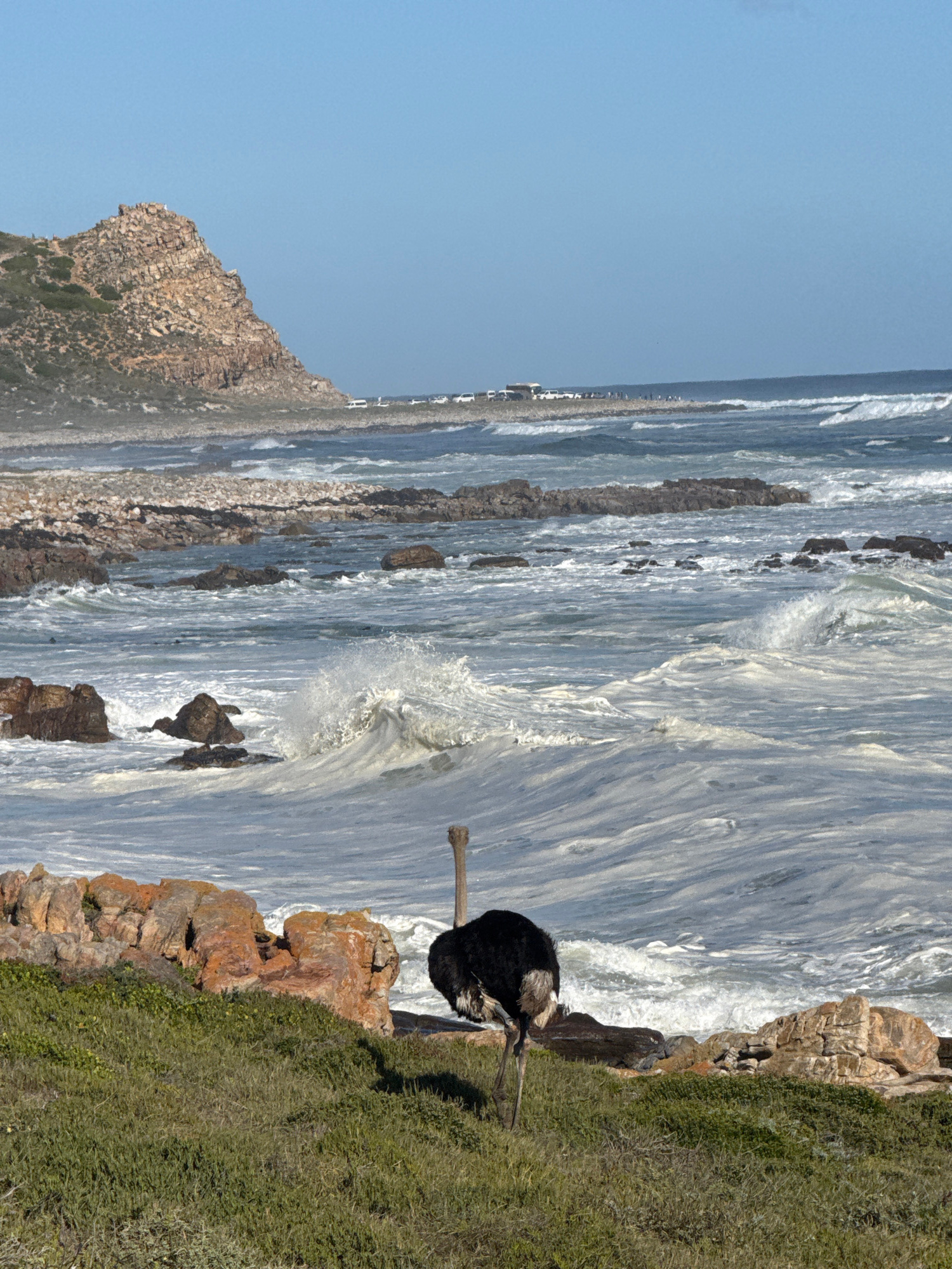 This image captures a scenic coastal landscape, likely in Cape Town, South Africa, featuring an ostrich against a backdrop of a turbulent ocean and a clear sky. The primary subject is a large ostrich…read more