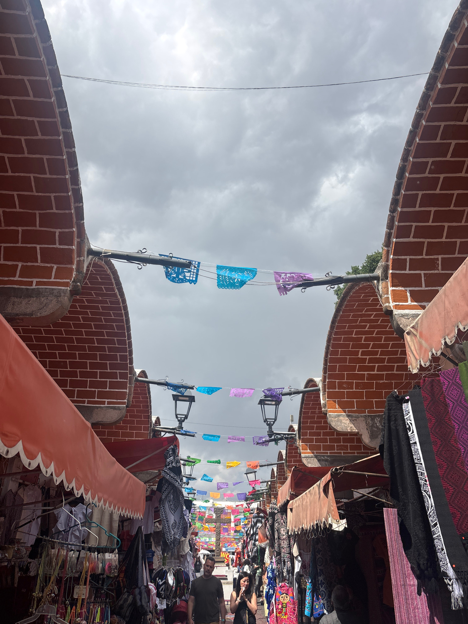 The scene depicts a marketplace in Puebla, Mexico, under an overcast sky. The camera angle is low, pointing upwards, emphasizing the arched brick structures that likely define the market stalls. These…read more