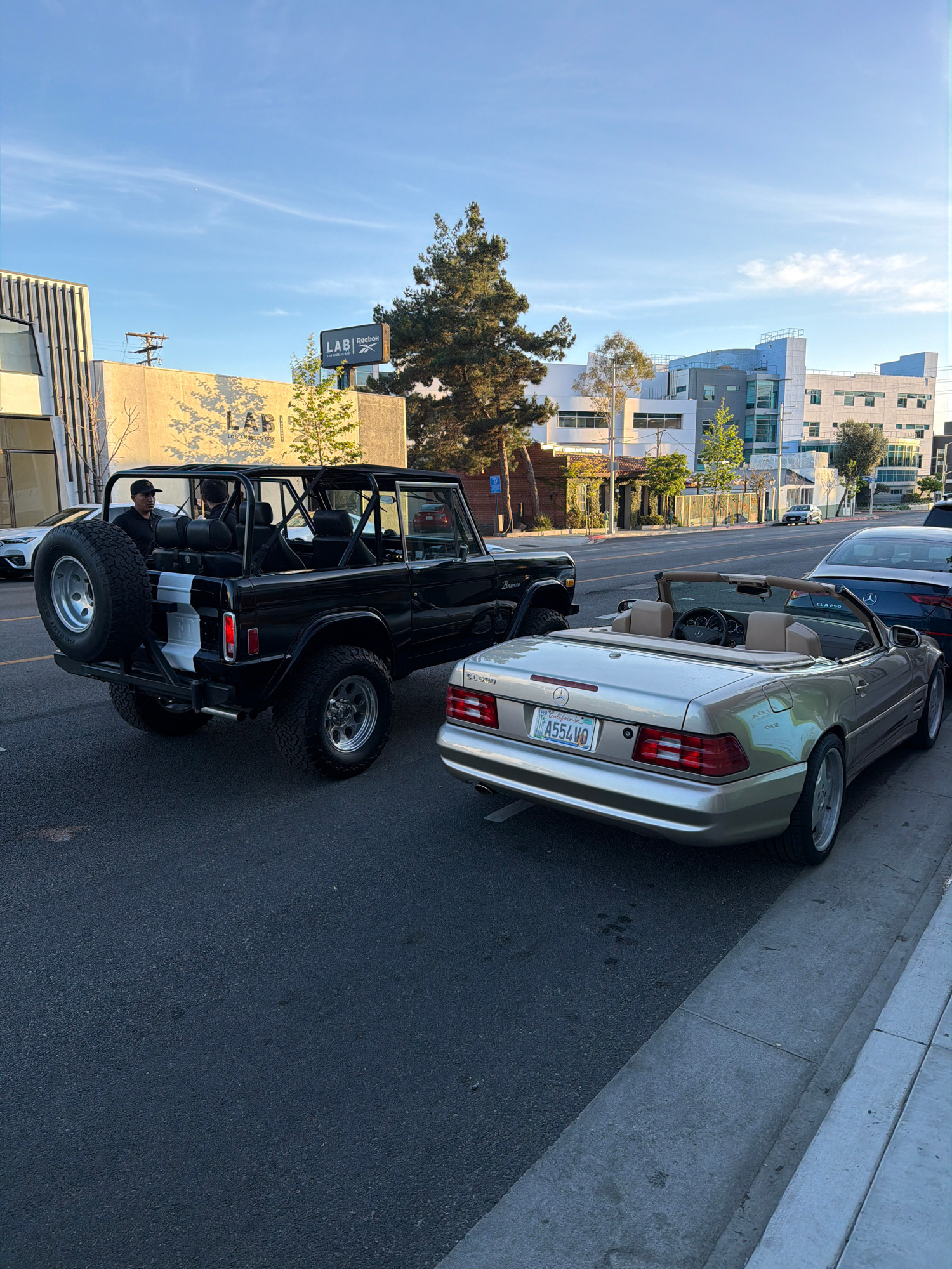 The image captures a street scene in West Hollywood, United States of America, featuring parked vehicles. A black Bronco is parked on the left, its rear facing the viewer. Beside it, a silver Mercedes…read more