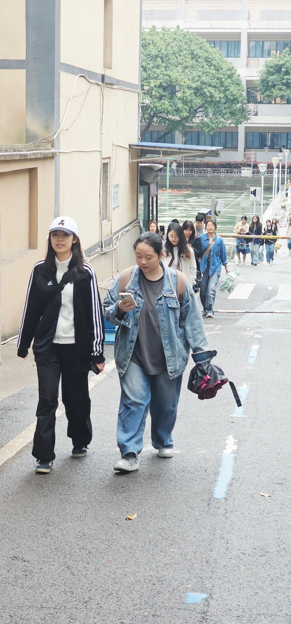 A group of people are standing on a gray asphalt surface next to a building in what appears to be an urban setting. The location may be Yuzhong District, China. The building is light colored with mult…read more