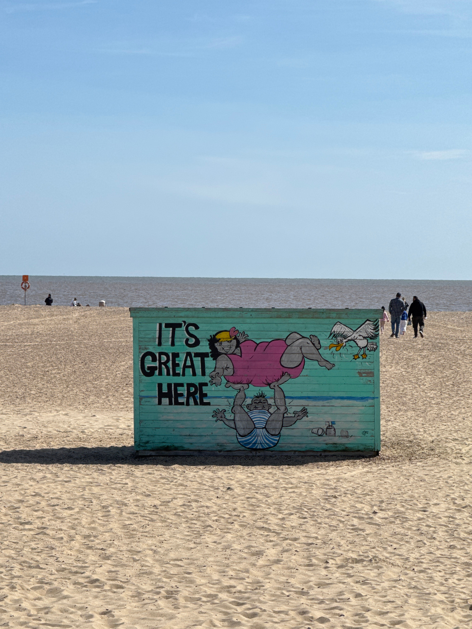 The photograph, taken at Great Yarmouth, United Kingdom, presents a seaside scene. The horizon line is located in the centre of the shot, with a clear sky in the upper left. A stretch of light brown b…read more