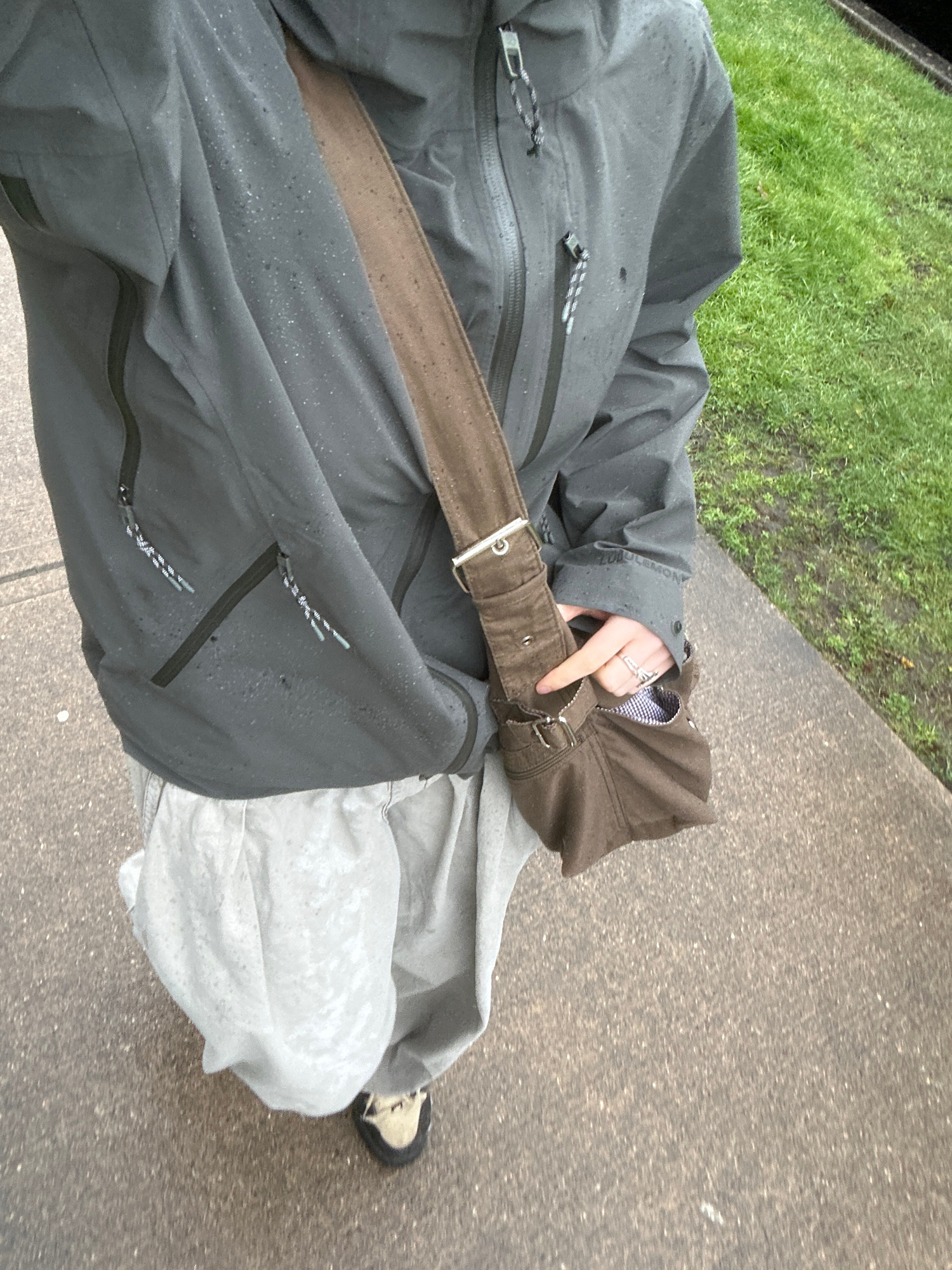 A person is standing on a sidewalk with one foot visible in a shoe. They are wearing a gray rain jacket, a light gray hoodie, and carrying a brown canvas bag over their shoulder. A hand with a ring isβ¦read more