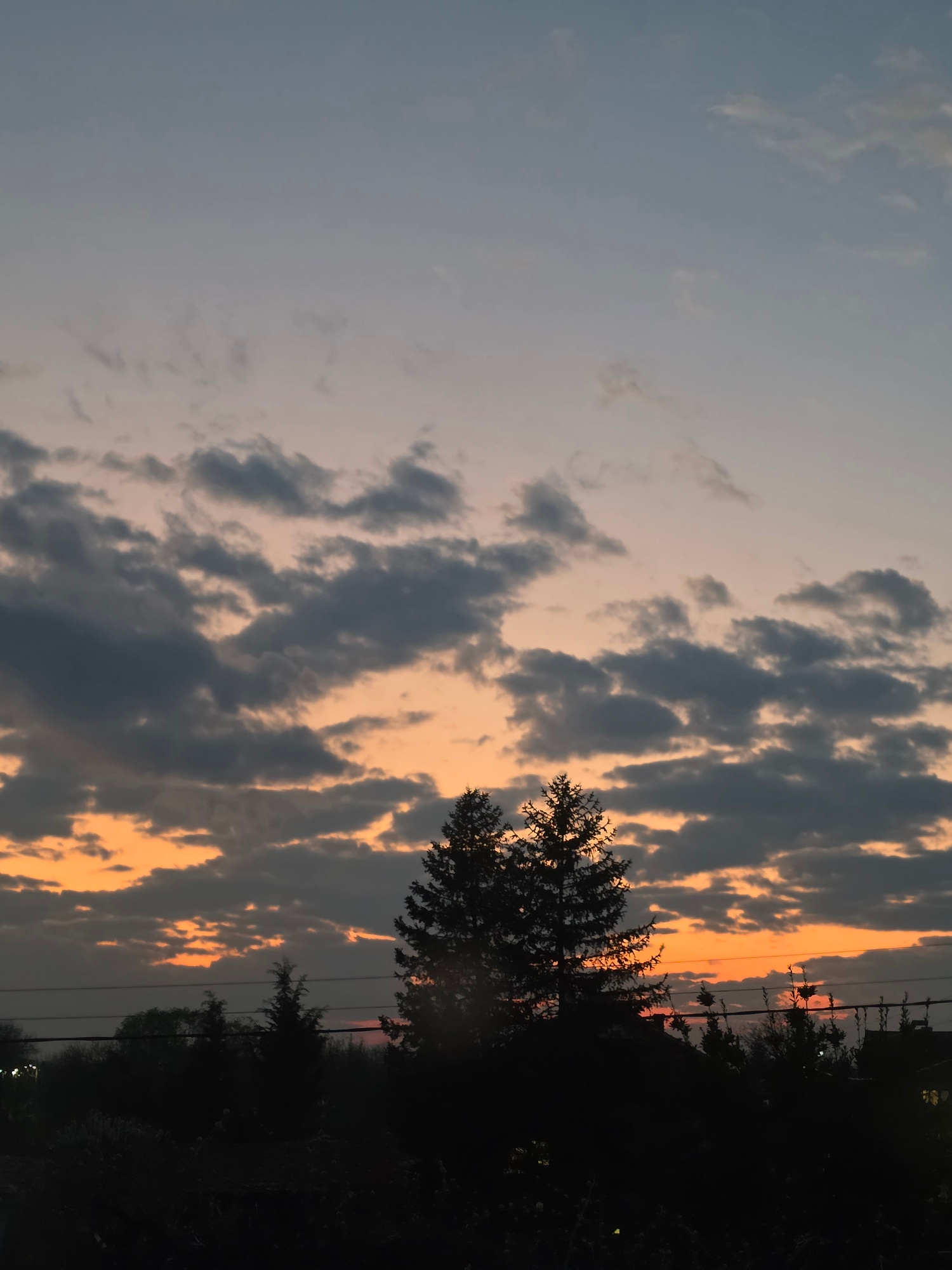 The image shows a sunset scene with a partially clouded sky over Yagodovo, Bulgaria. The clouds are illuminated with orange light from the setting sun, contrasting with darker grey areas. Silhouetted…read more