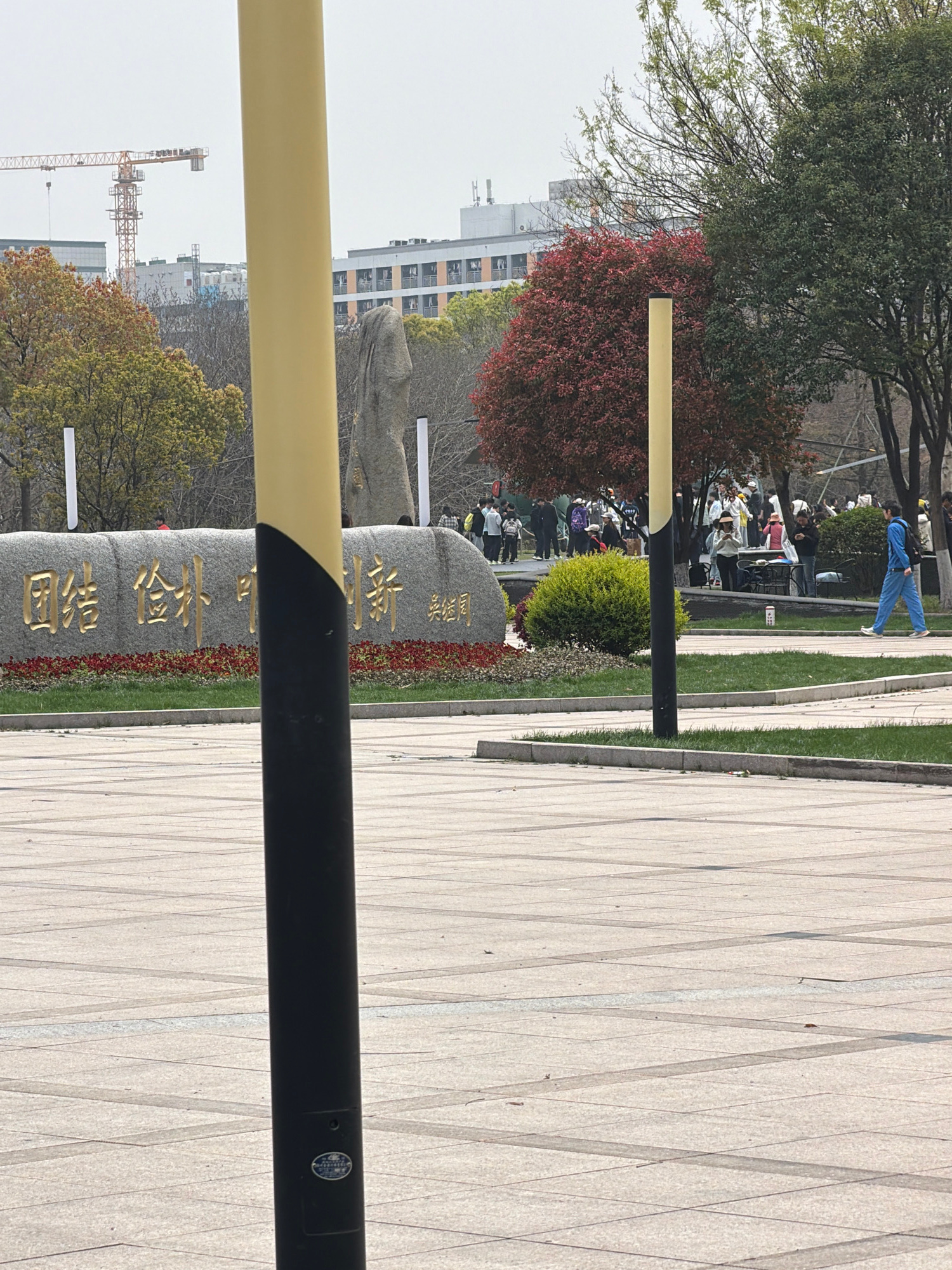 This image depicts an outdoor scene in Jiangning District, China, featuring a paved walkway with rectangular stone patterns. A stone monument with vertical Chinese inscriptions is positioned to the le…read more