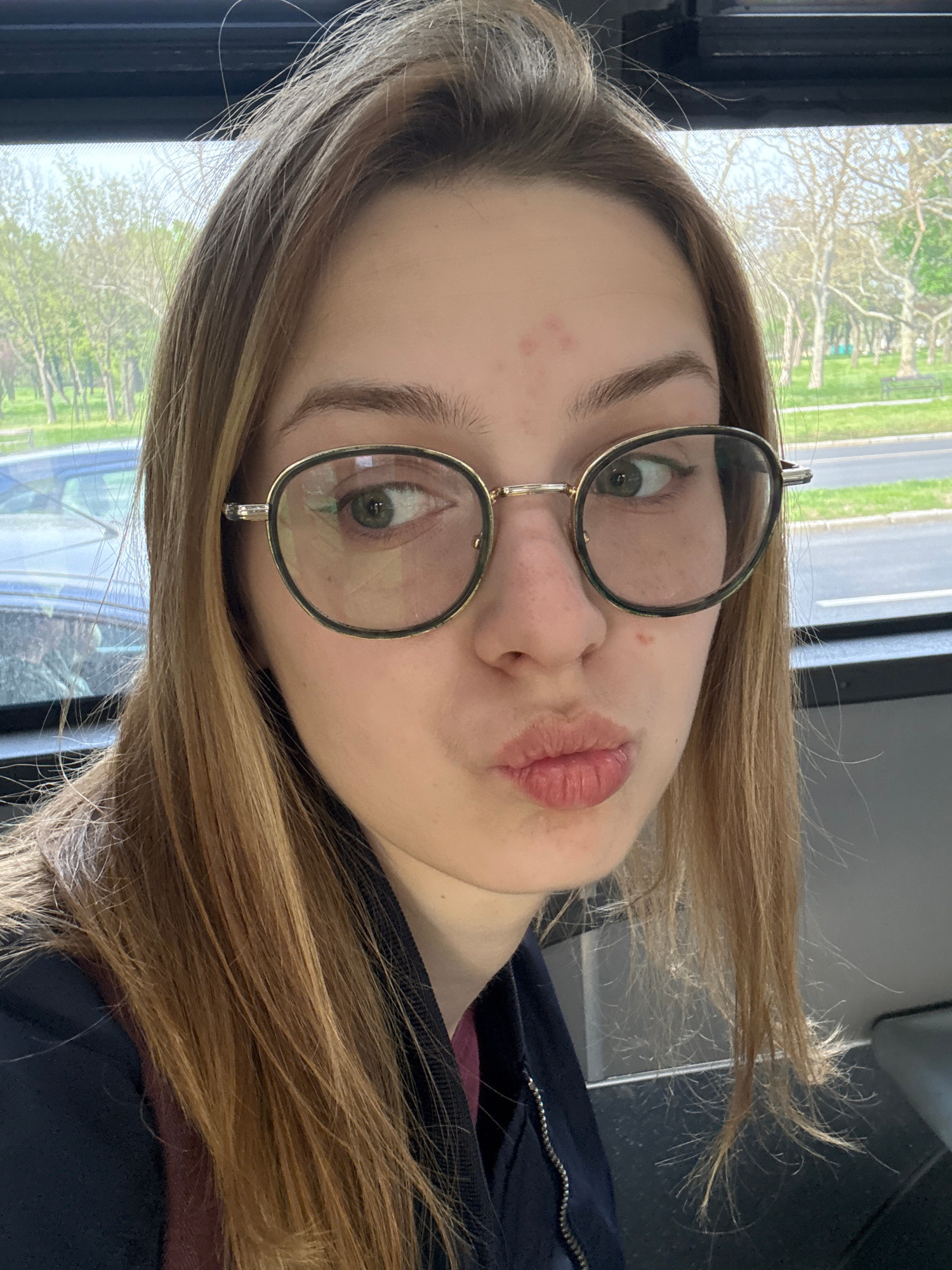 A young woman with light brown hair is wearing glasses and has light skin. She appears to be in a vehicle, possibly a bus, based on the window and the presence of a black frame around it. Outside the…read more