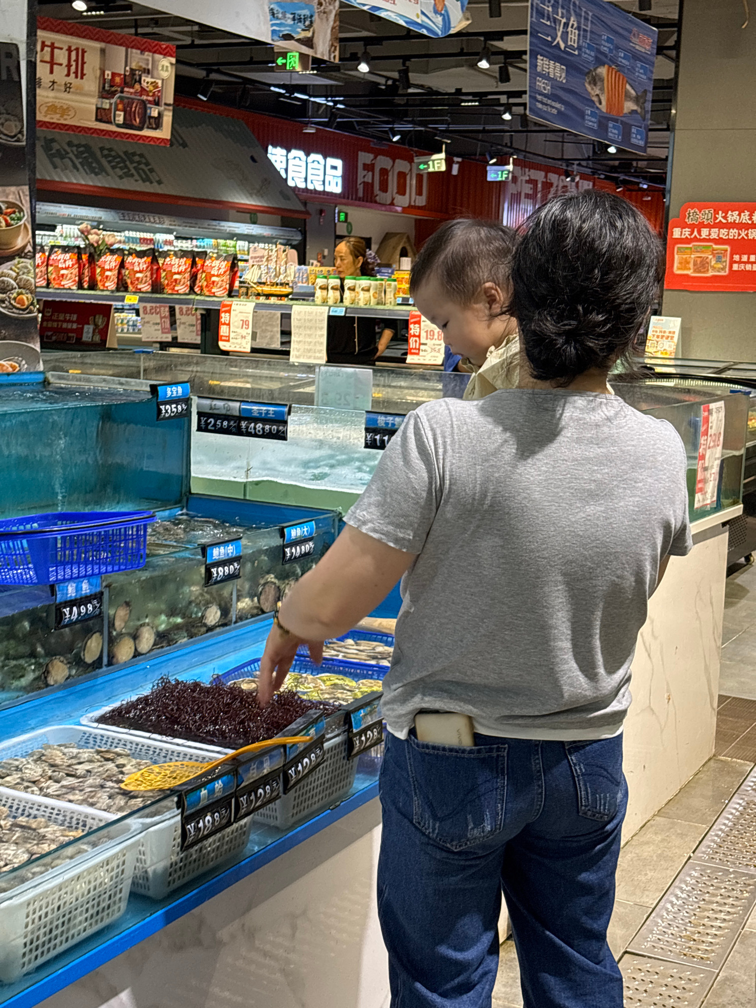 Here is a description of the image: The photo was likely taken indoors, possibly in a supermarket or grocery store in Jiangjin, China. An adult wearing a light gray t-shirt and jeans is standing near…read more