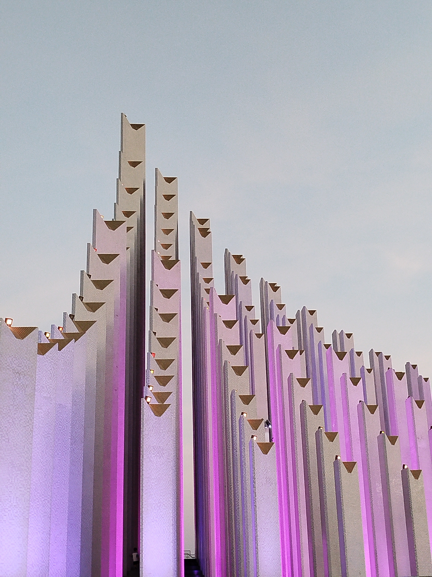 The image shows the Vietnam National University, Ho Chi Minh City, Vietnam, a monument consisting of numerous tall, gray concrete pillars of varying heights. The pillars are arranged in a rising patte…read more