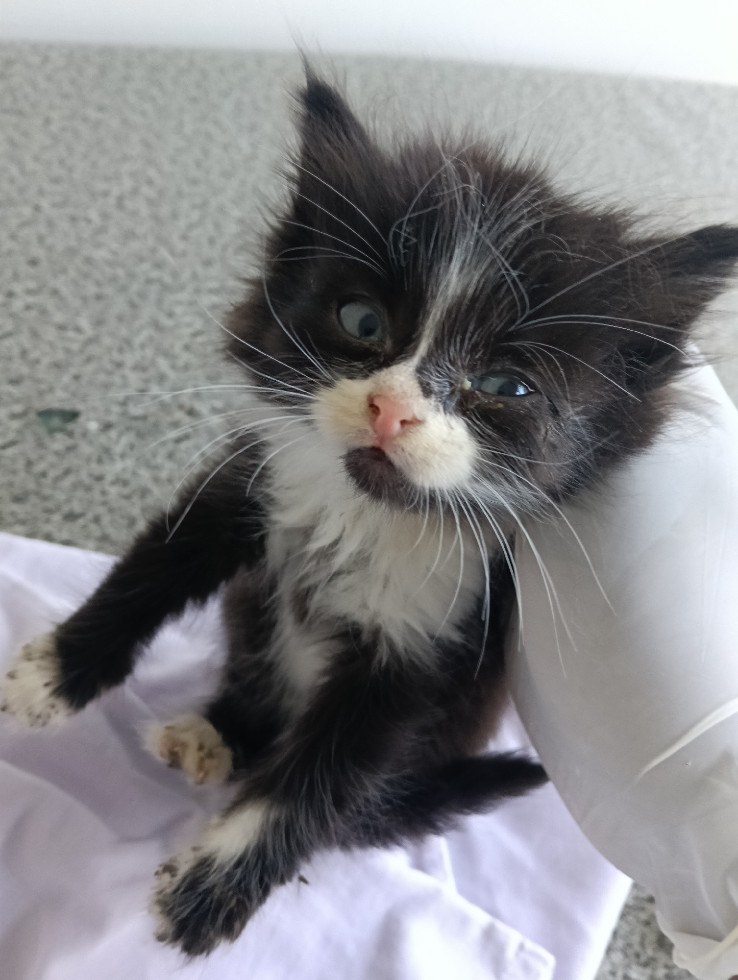 A small, scruffy kitten with black and white fur is held in a gloved hand. The kitten has a pink nose, long white whiskers, and appears to have a slight eye discharge in one eye. The kitten's paws are…read more