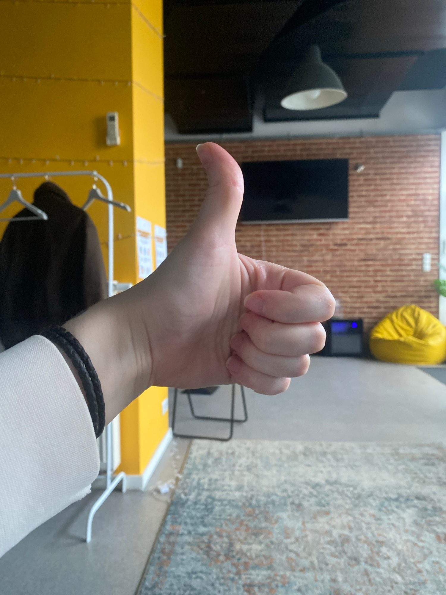A person's hand, giving a thumbs-up gesture, is in the foreground. The person is wearing a white shirt and a black bracelet. The background consists of a room with various objects including yellow sto…read more
