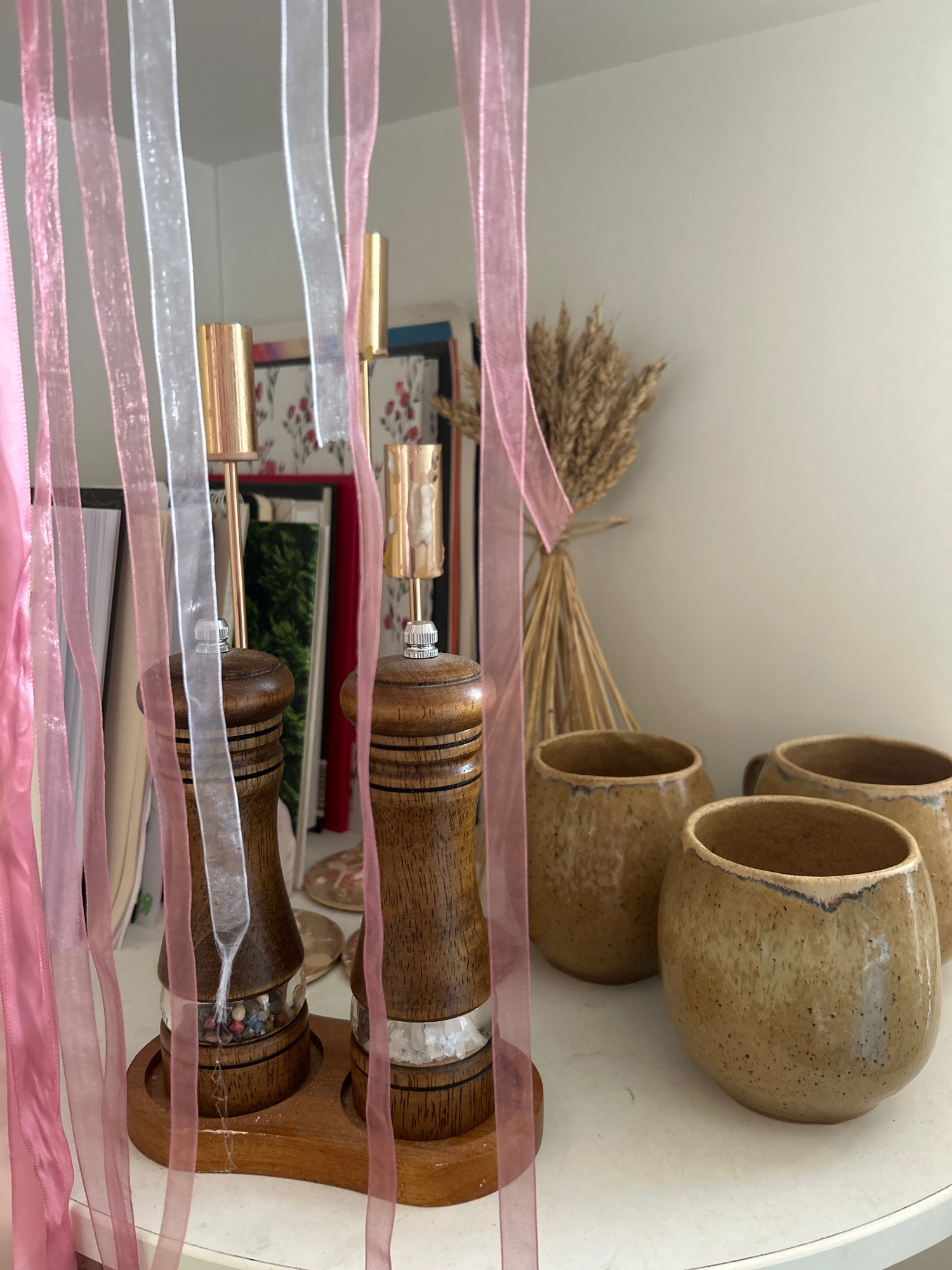 A still life scene is captured on a shelf, featuring several objects. Three ceramic mugs with a grainy texture are positioned on the top right, next to a bouquet of wheat tied with a pink ribbon. Belo…read more