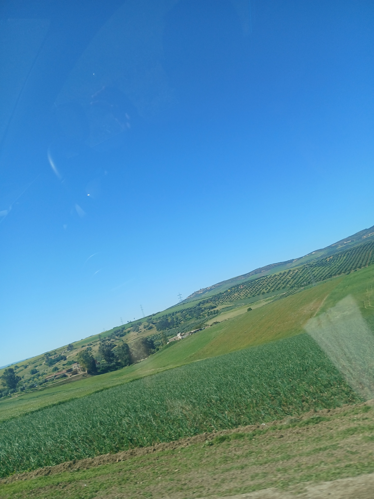 The image depicts an aerial view, possibly taken from an aircraft, showing a landscape in the vicinity of Dkhissa, Morocco. The scene is divided between a clear blue sky and fields. The land features various shades of green, suggesting different types of vegetation or crops. A line of trees or shrubs and power lines are visible, separating the fields from a cultivated area. The image seems taken from the air. | Open Wire