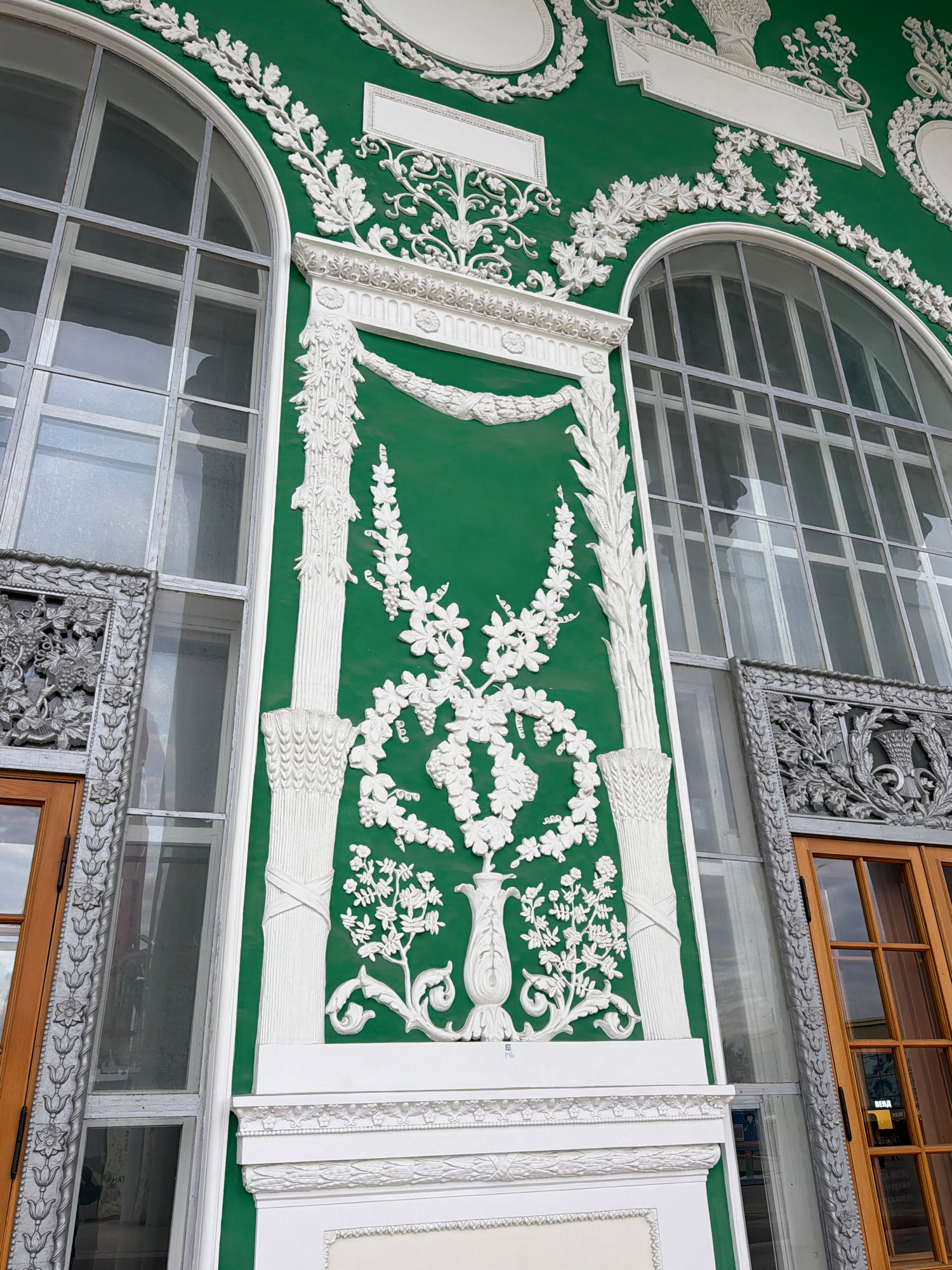 The image shows a fragment of architectural decor, likely part of a building facade. The background is painted a deep green, and overlaid with ornate white plaster or stucco relief. The relief include…read more