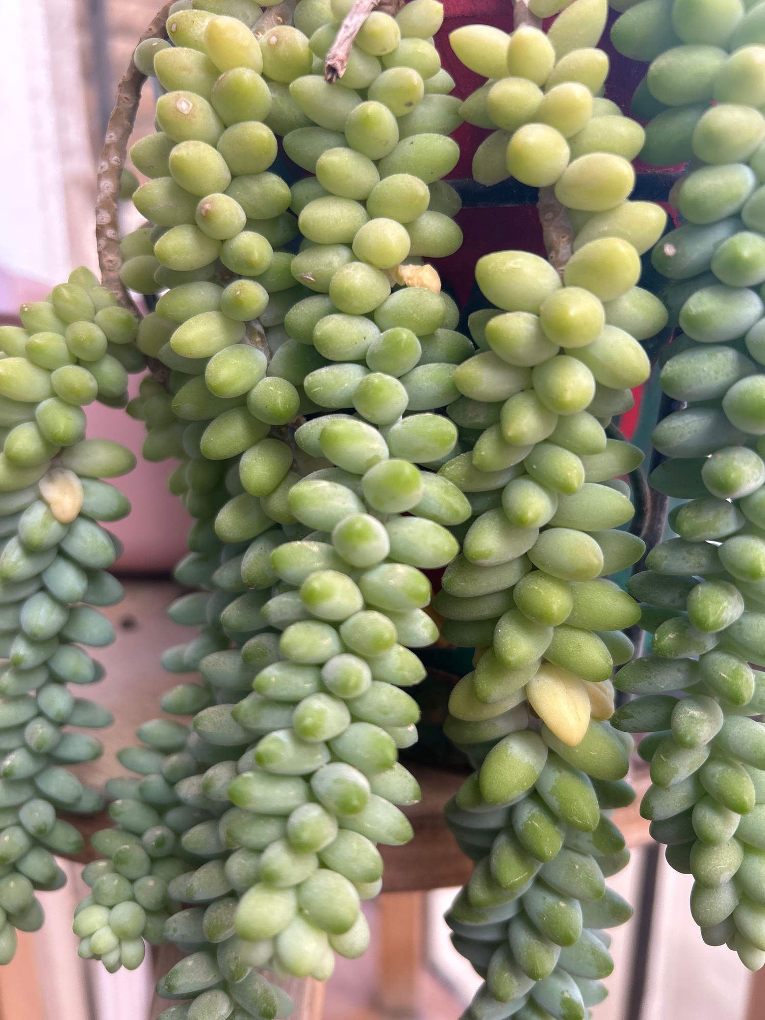 The image presents a detailed, close-up view of a healthy Sedum morganianum succulent, commonly known as Burro's Tail or Donkey's Tail. The primary subjects are several long, trailing stems heavily la…read more
