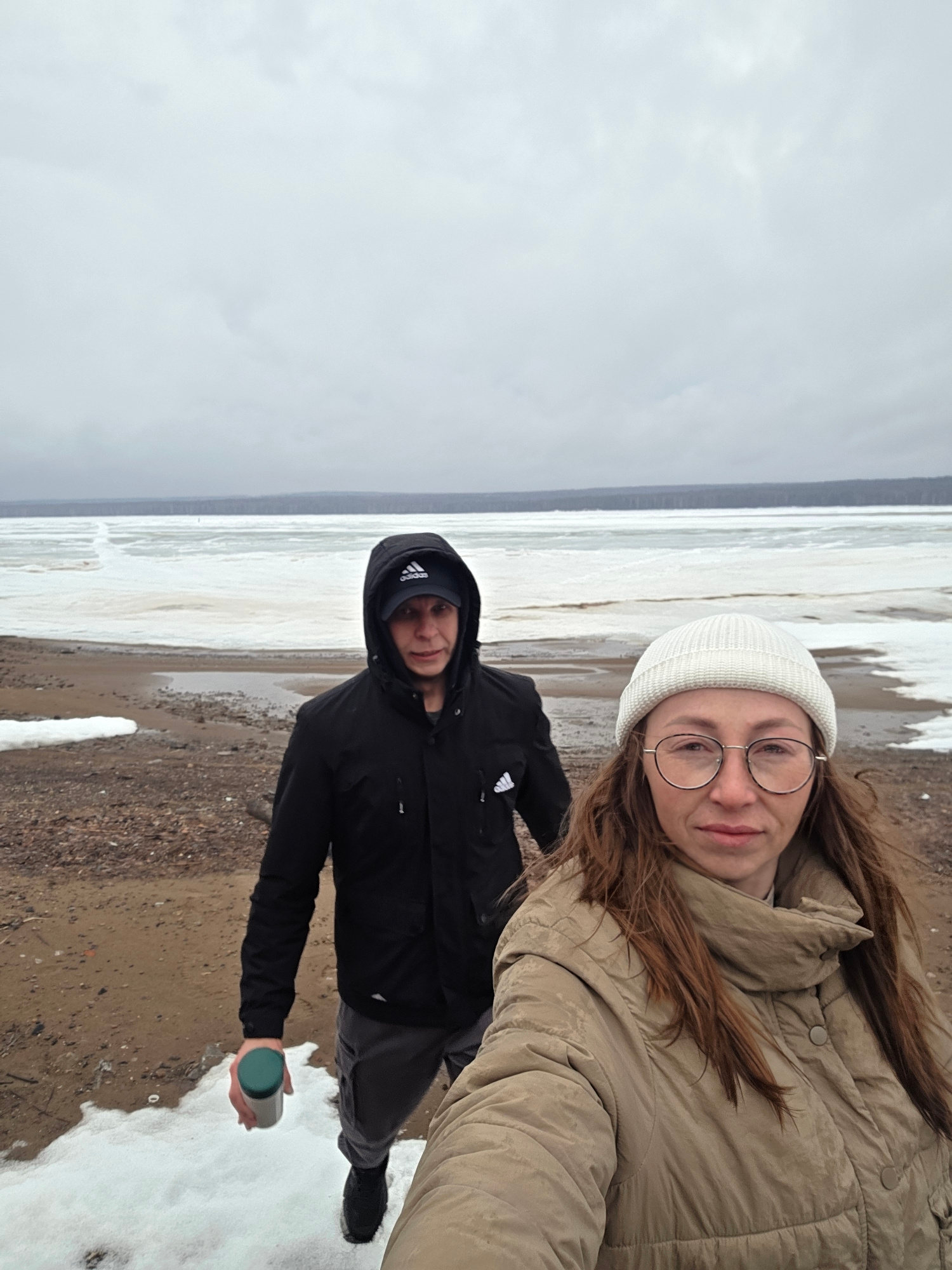 Two people are in the photo. A woman with glasses and a white beanie is wearing a beige coat. Next to her, a man is wearing a black jacket, black pants, and a black hat with the Adidas logo. He is hol…read more