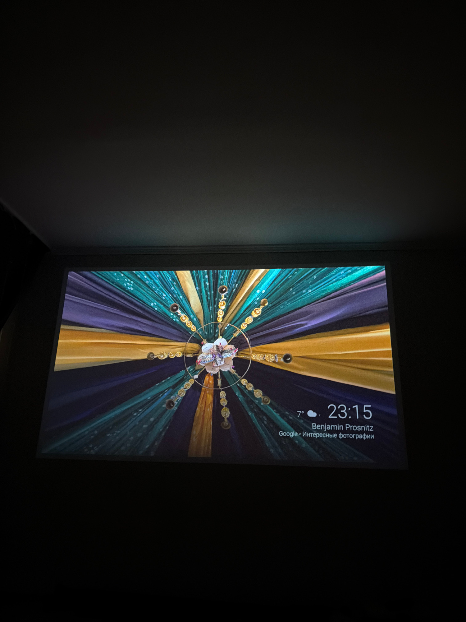 A monitor displays a clock and name on a colorful patterned background. The time is 23:15, and the name displayed is Benjamin Prosnitz. Also visible are the words Google and "Интересные фотографии" (I…read more