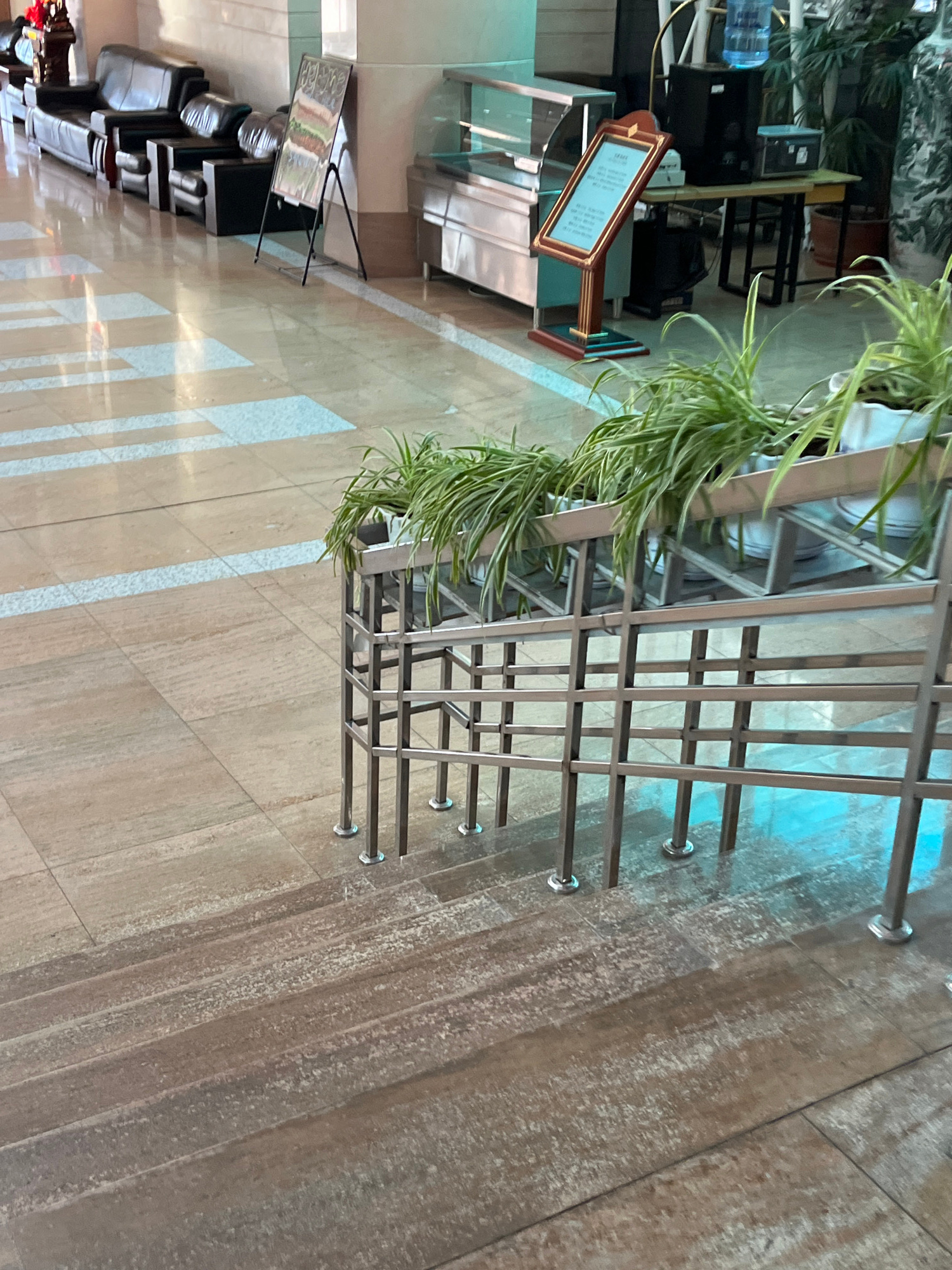 The image depicts an indoor scene, possibly within a hotel or commercial building in Changchun City, China. The scene includes a series of stainless steel plant stands holding trailing plants. The flo…read more