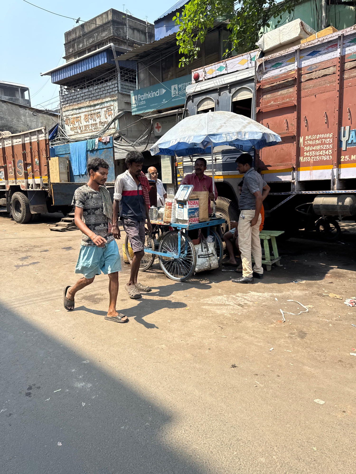 The image shows a street scene in Kolkata, India. A man is standing in the foreground wearing a patterned shirt and blue shorts, walking to the right of the frame. Behind him, two men stand near a mob…read more