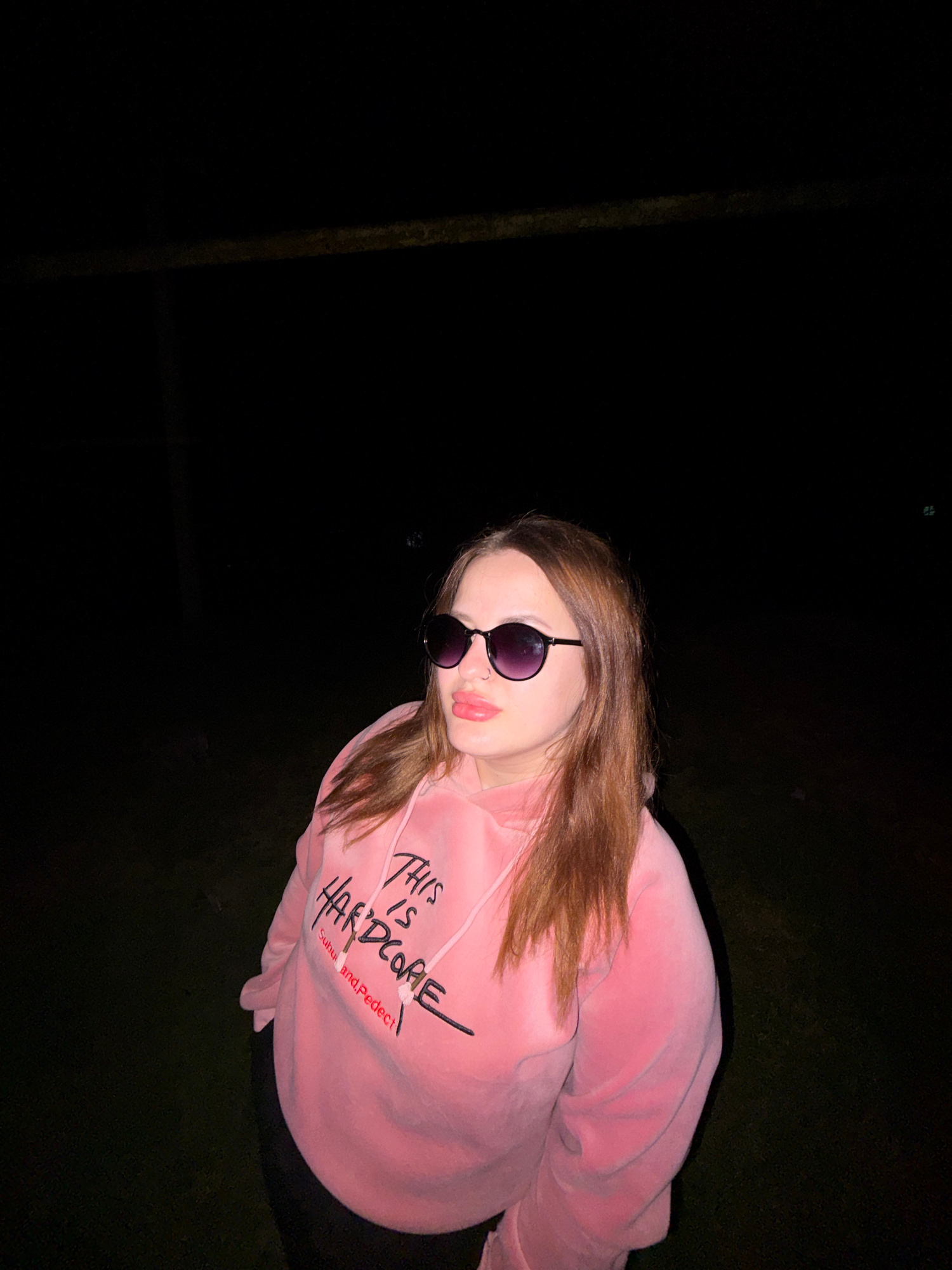 A woman with brown hair and sunglasses is wearing a pink sweatshirt with the words "THIS IS HARDCORE" on it. She is standing outdoors at night. The location cannot be determined as being within the ci…read more