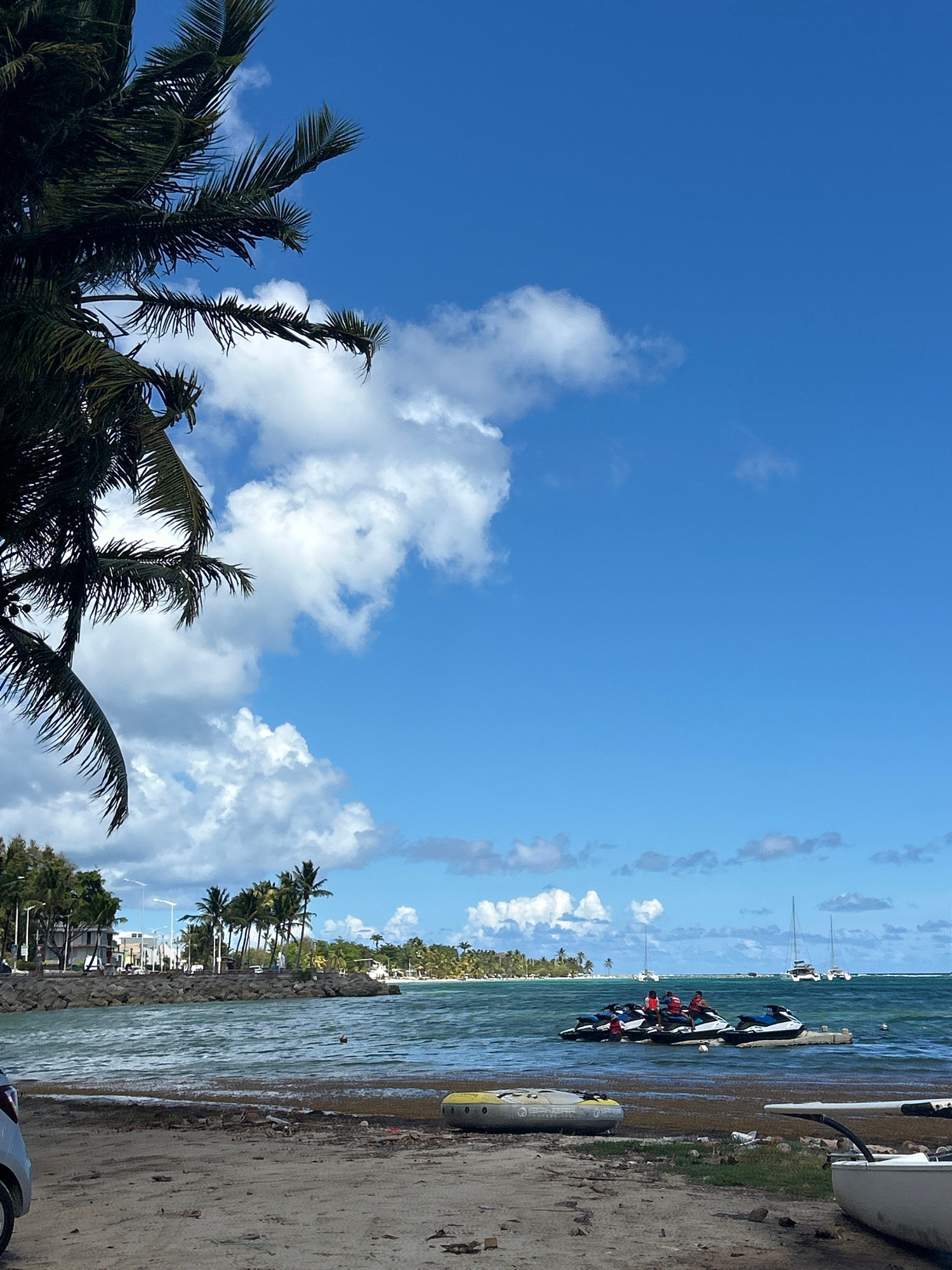 The image shows a beach scene in Sainte-Anne, France, captured on a sunny day with blue skies and scattered clouds. Palm trees are visible in the foreground and along the coastline. Several jet skis a…read more