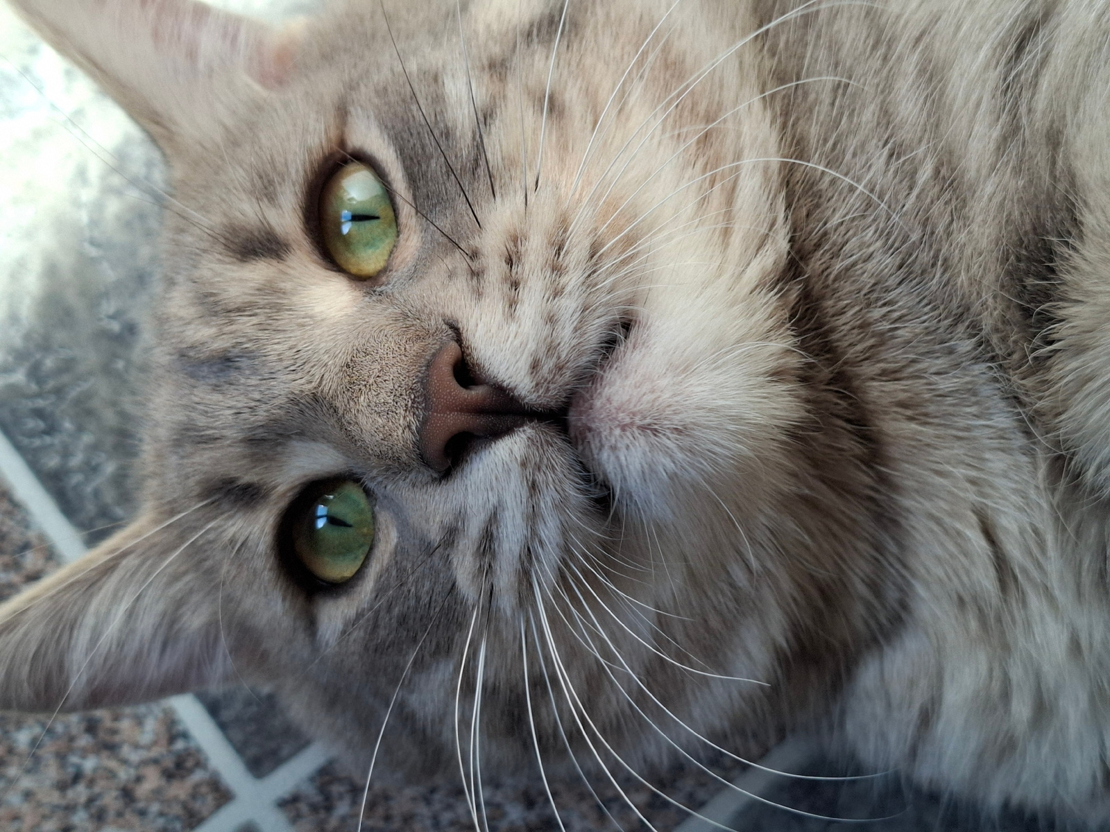A close-up photograph shows a gray tabby cat lying on a tiled surface. The cat's face is tilted, with its green eyes looking directly at the viewer. The cat has a pink nose and white whiskers. The bac…read more